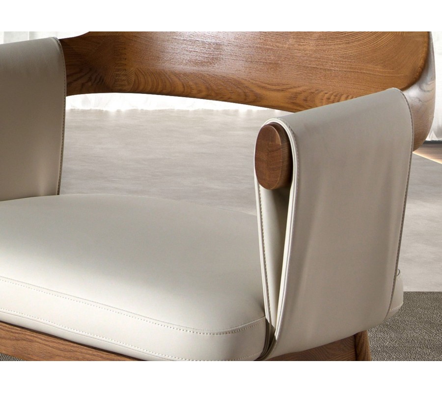 Křeslo má mohutnou siluetu, která poskytuje štědrý prostor k sezení. Sedadlo tvoří bohatě čalouněný obdélníkový polštář se zaoblenými liniemi, který je položen na dřevěných lineárních výztuhách, propojujících nožičky. Ty mají válcovitý tvar a jsou mírně sešikmené, což zajišťuje výbornou stabilitu.