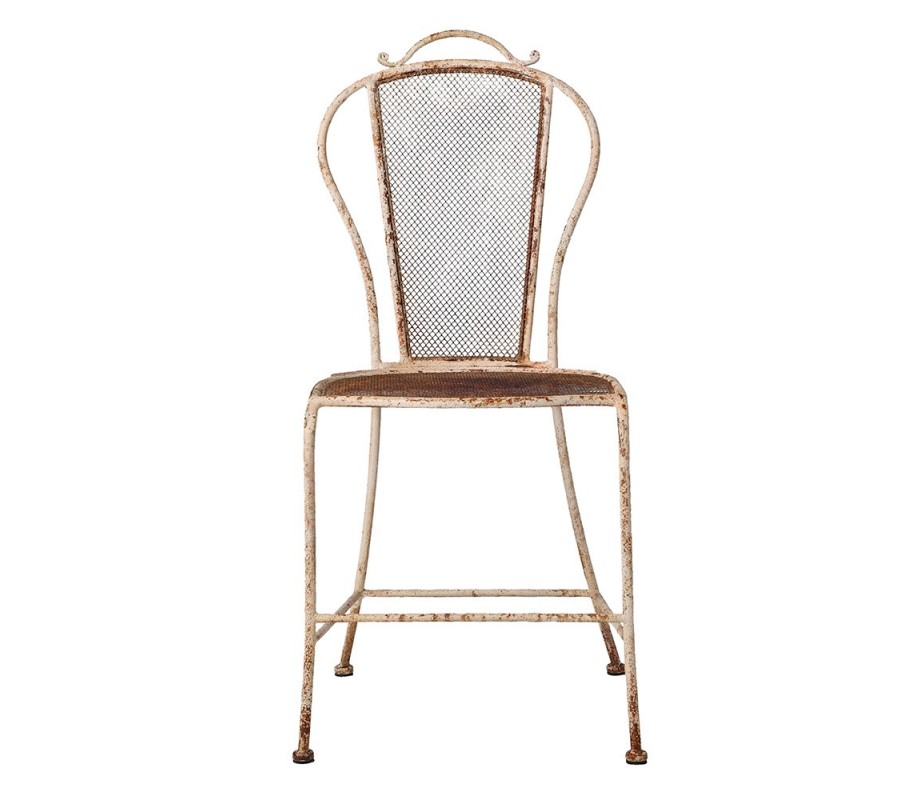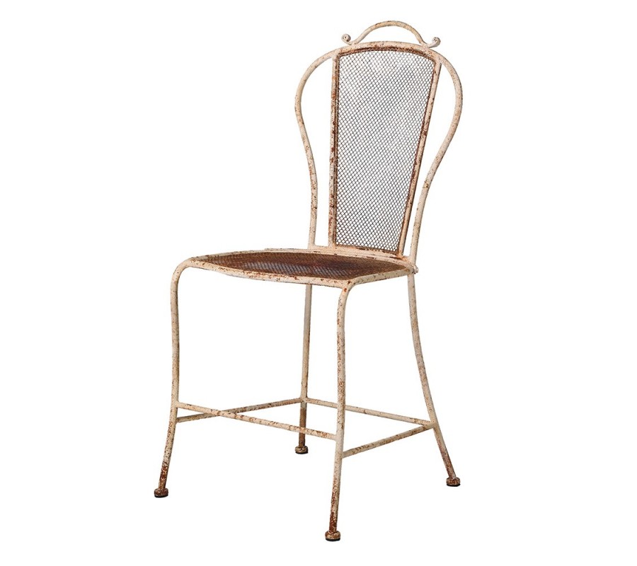 Vintage kovová zahradní jídelní židle Bellezza je stylový kus nábytku, který v sobě spojuje lehkost tenké kovové konstrukce s uměleckými detaily a autentickou patinou. Konstrukce je laděna do bílého odstínu se záměrnou rezovou povrchovou úpravou, která podtrhuje její vintage charakter.