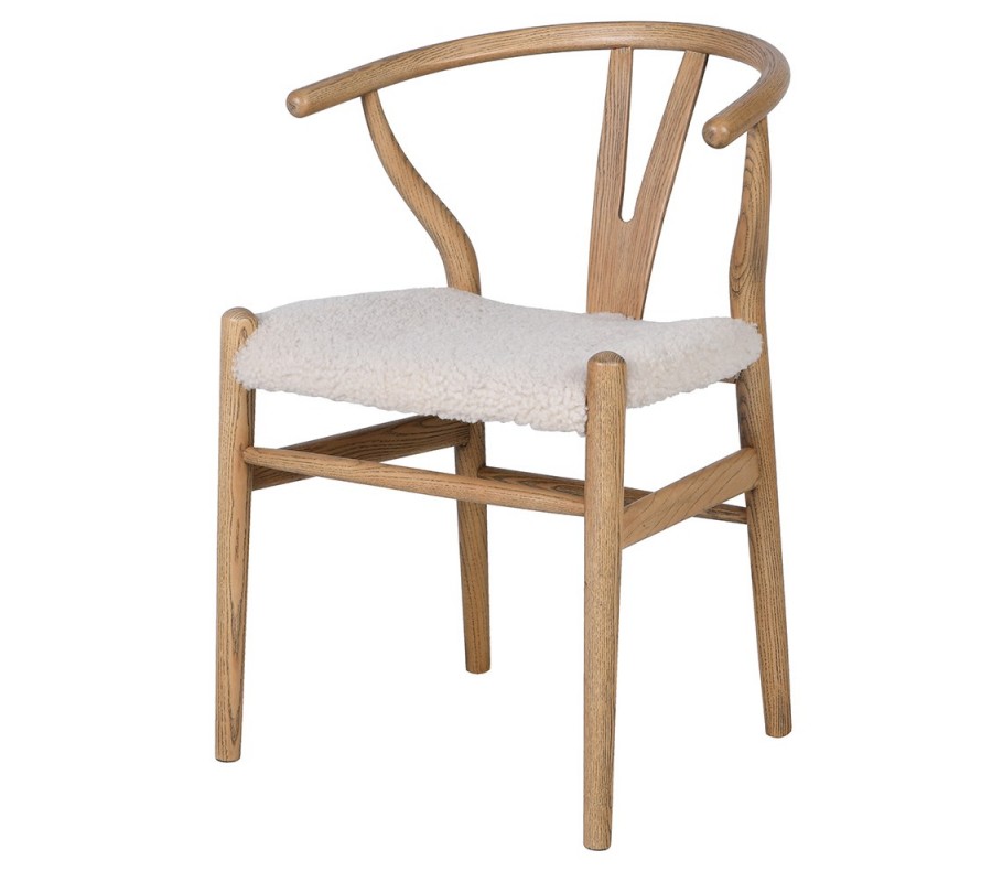 Skandinávská jídelní židle Classic z jasanového hnědého dřeva s opěradlem ve tvaru Y a bílým potahem z ovčí vlny 79 cm