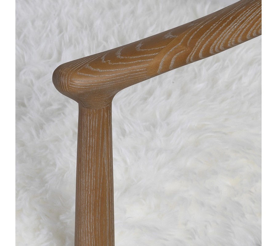 Konstrukce je vyrobena z jasanového dřeva v teplém hnědém odstínu s jemně viditelnou kresbou dřeva, která dodává židli přirozený vzhled. Úzké, hladké a zaoblené opěrky na ruce spolu s mírně vyosenými zadními nožičkami podtrhují její lehkost a elegantní siluetu.