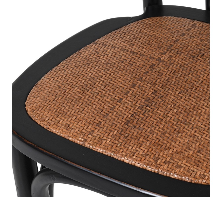 Stylová ratanová jídelní židle Noir Bentwood spojuje eleganci klasického tvaru s přírodním půvabem ratanu. Vyznačuje se černou dřevěnou konstrukcí s lesklým lakovaným povrchem, která vytváří působivý kontrast s hnědým ratanovým výpletem sedáku. Ratanový výplet ve vzoru rybí kosti dodává povrchu zajímavou strukturu a jemný dekorativní efekt, který umocňuje přirozený charakter židle.