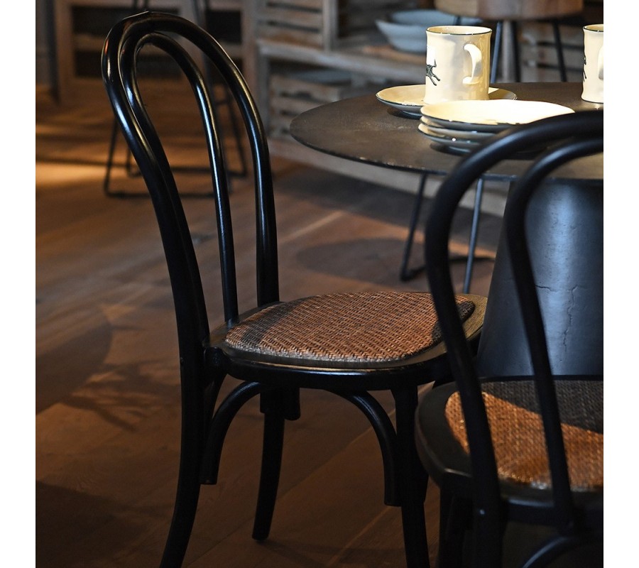 Tento model se dokonale hodí do vintage, industriálních i bistro interiérů, kde vynikne kontrastem černého lesku a přírodního ratanu. V jídelně působí elegantně a útulně, v kavárně nebo restauraci dodá prostoru autentickou atmosféru s jemným nádechem minulosti. Skvěle se kombinuje s dřevěnými nebo kovovými stoly, s doplňky v mosazném nebo černém provedení as textiliemi v krémové, šedé či okrové barvě.