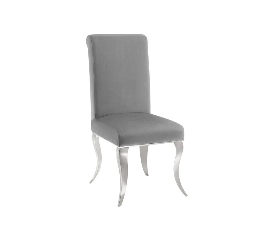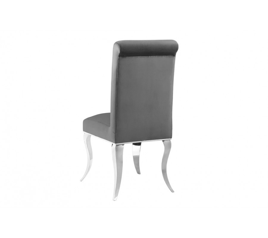 Výrazným designovým detailem jsou kabriolové nohy z nerezavějící oceli ve stříbrném provedení. Jejich elegantně prohnutý barokní tvar dodává židli noblesu a dekorativní akcent, zatímco ocelový materiál zaručuje stabilitu, pevnost a dlouhou životnost. Lesklý povrch nohou jemně odráží světlo a zvýrazňuje glamour charakter židle.