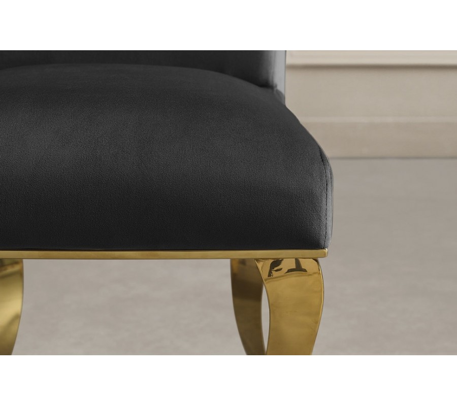 Dominantním vizuálním prvkem jsou kabriolové nohy z nerezavějící oceli ve zlatém provedení. Jejich elegantně prohnutý barokní tvar dodává židli noblesu a dekorativní akcent, zatímco pevná ocelová konstrukce zajišťuje stabilitu, odolnost a dlouhou životnost. Lesklý zlatý povrch nohou krásně odráží světlo a umocňuje glamour vzhled židle.