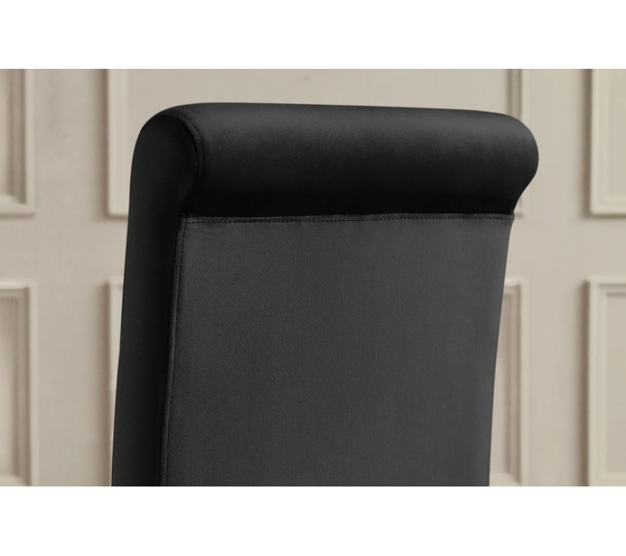 Sametový potah z odolného mikrovlákna v černé barvě působí nadčasově, exkluzivně a dodává interiéru sofistikovaný charakter, díky čemuž se židle stává dominantním designovým prvkem jídelny. Židle je řešena bez opěrek na ruce, což jí dodává štíhlý, elegantní vzhled a umožňuje snadné zasunutí pod stůl.