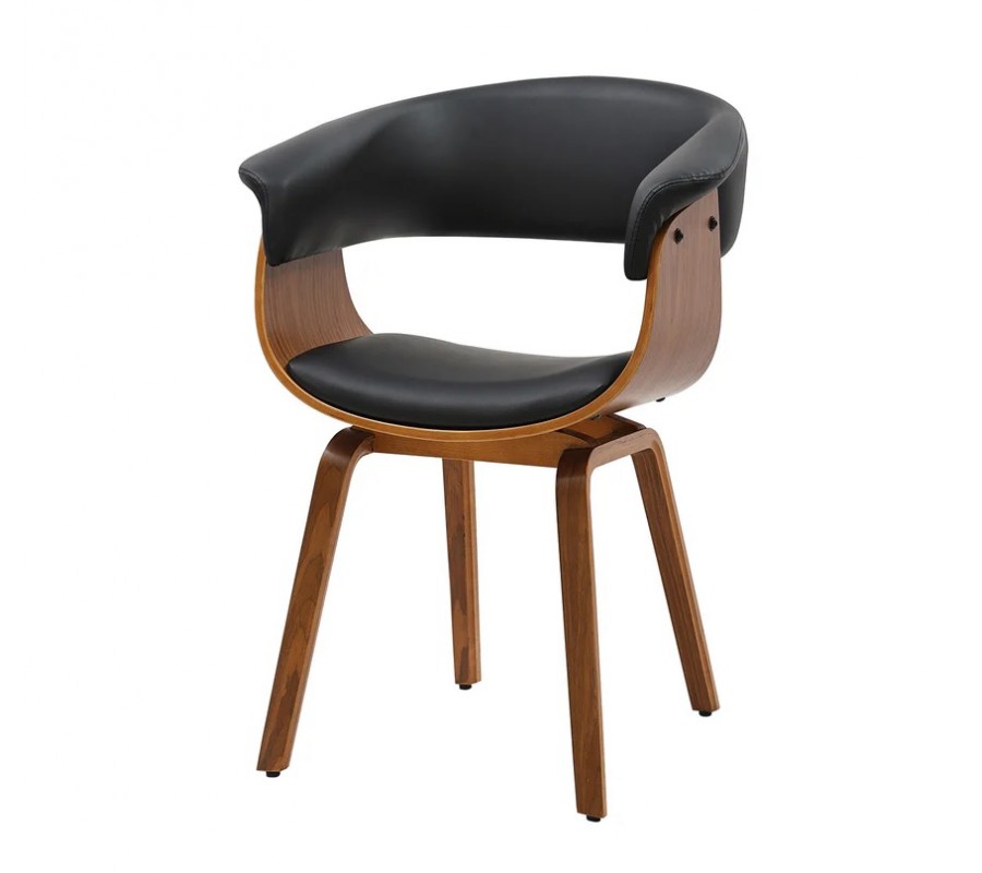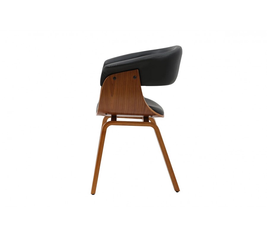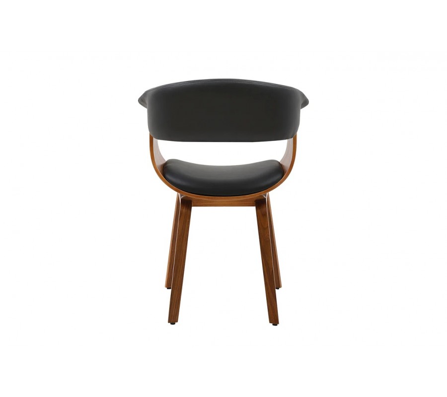 Židle je vyrobena z pevného dýhovaného dřeva v bohaté ořechové hnědé povrchové úpravě. Kresba letokruhů působí teplým naturálním dojmem. Opěrka a sedák jsou čalouněné, s potahem z ekokůže. Materiál je hladký, příjemný na dotek a černá barva vytváří stylový kontrast ke dřevu.