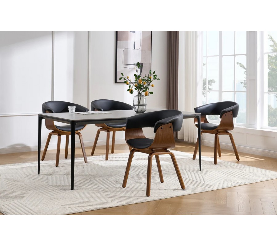 Jídelní židle Ecco přinese do vaší domácnosti moderní design a přírodní vizuál. Spojení ořechově hnědé barvy dřeva s černou kůží působí sofistikovaným dojmem a unikátní silueta z ní činí nejen funkční, ale také vizuálně atraktivní doplněk místnosti.
