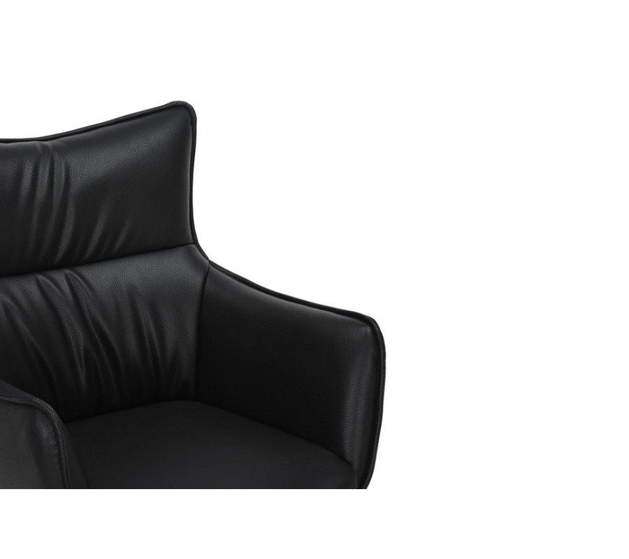 Designu dominuje potah z ekokůže v černé barvě. Povrch je hladký, příjemný na dotek a materiál je nenáročný na údržbu. Obdélníkové sedátko ohraničují na bocích nižší opěrky na ruce a vzadu vyšší zádová opěrka. Jejich rovné linie doplňují efektně vytažené rohy, které působí dynamickým dojmem. Měkká výplň tvary jemně zaobluje a dodává siluetě eleganci. Horizintální prošívání na opěrce působí minimalistickým dojmem.