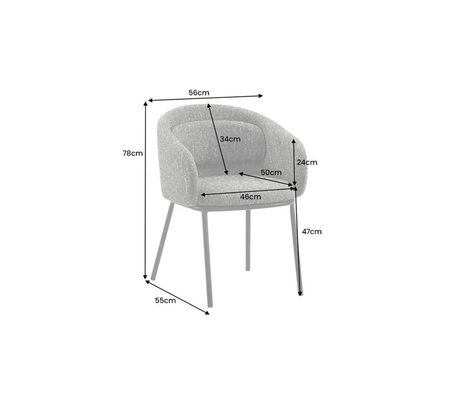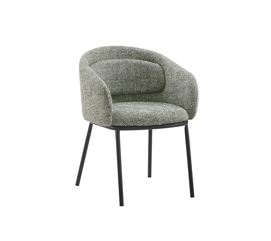 Křeslo má elegantní siluetu, ve které dominují rovné linie v kombinaci s ladnými křivkami. Podstavu tvoří čtyři štíhlé válcovité nožičky. Díky sešikmeným liniím poskytují výbornou stabilitu a design zároveň působí odlehčeným dojmem. Provedení z kovu s matným černým nástřikem dodává židli moderní industriální nádech.