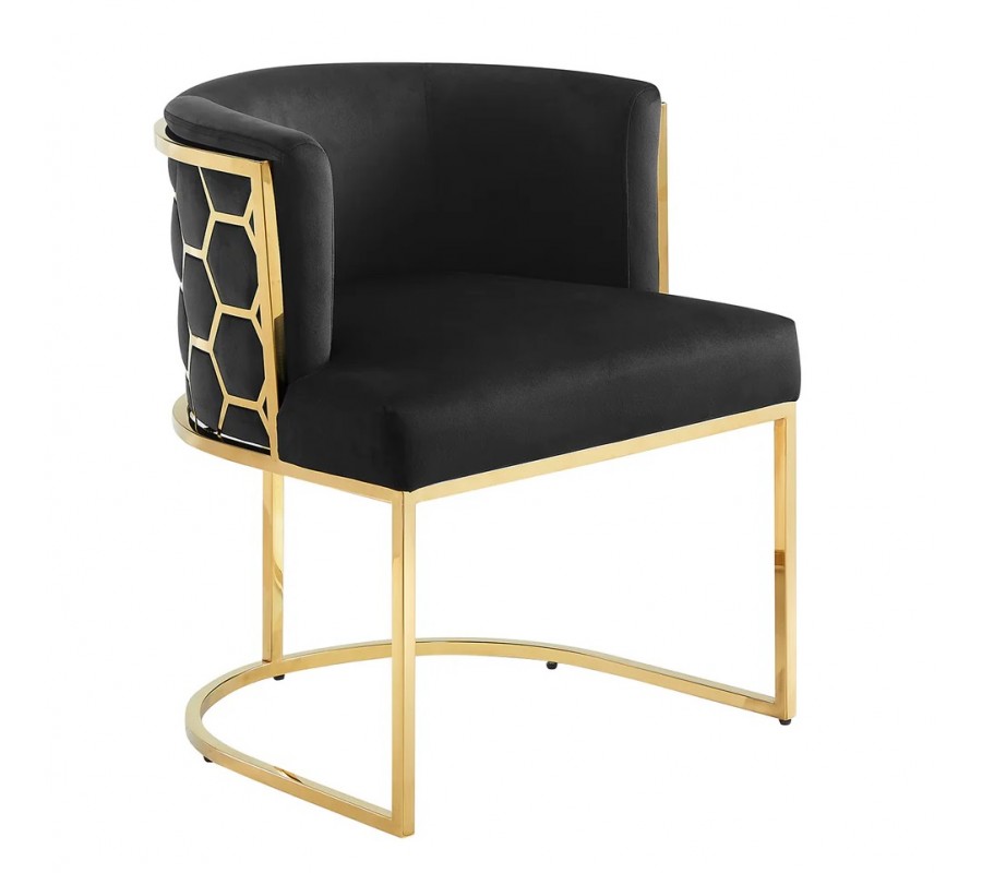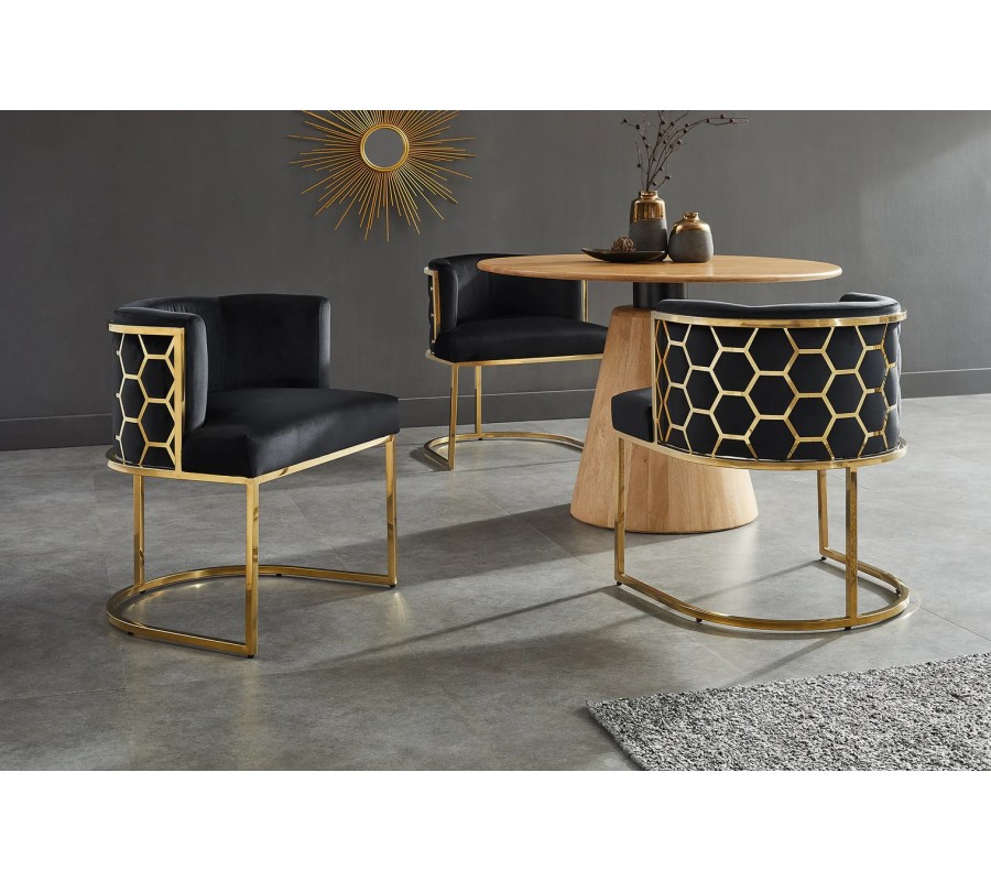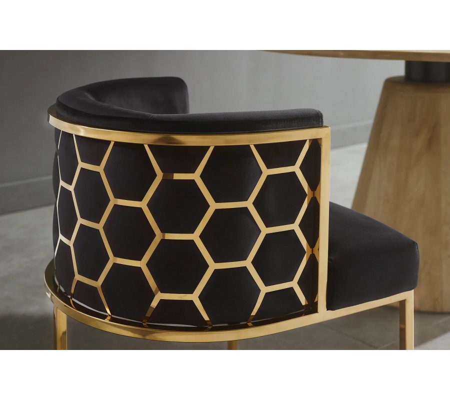 Glamour jídelní židle Leara s černým sametovým potahem a zlatou kovovou konstrukcí se vzorem medového plátu 75 cm
