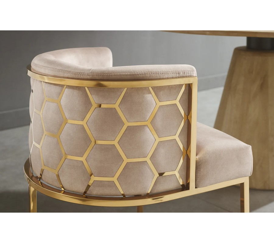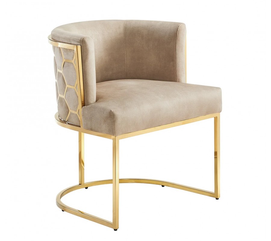 Art deco jídelní židle Leara s béžovým sametovým potahem a zlatou kovovou konstrukcí se vzorem medového plátu 75 cm