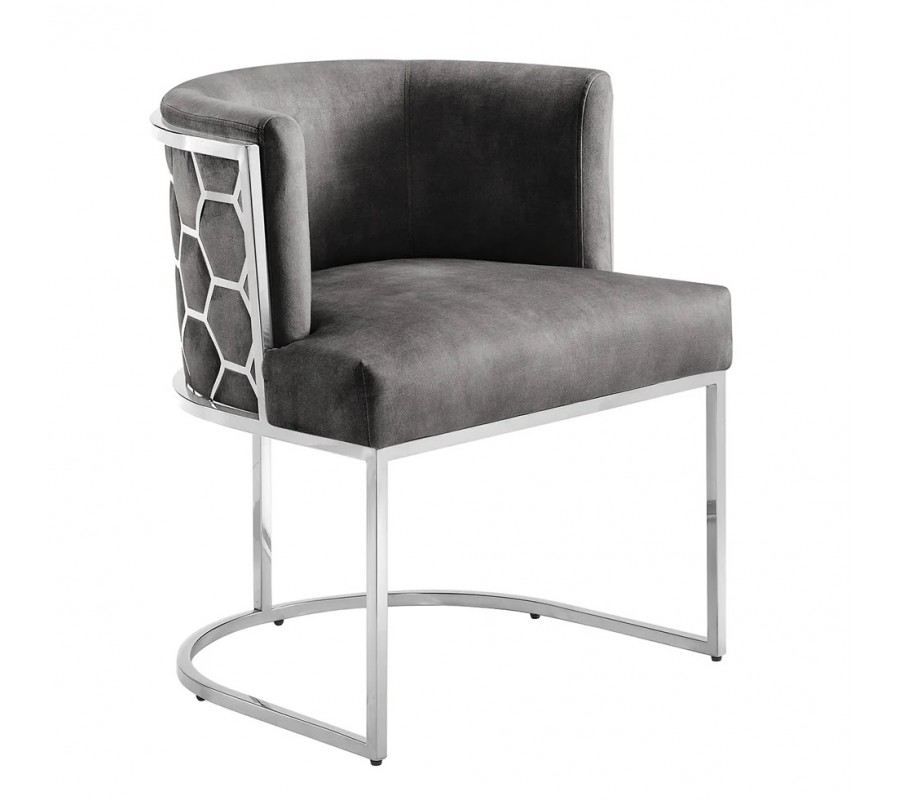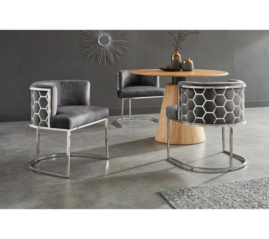 Art deco jídelní židle Leara s šedým sametovým potahem a stříbrnou kovovou konstrukcí se vzorem medového plátu 75 cm