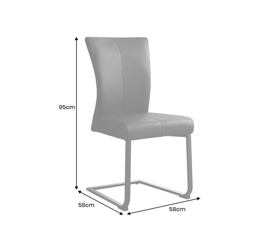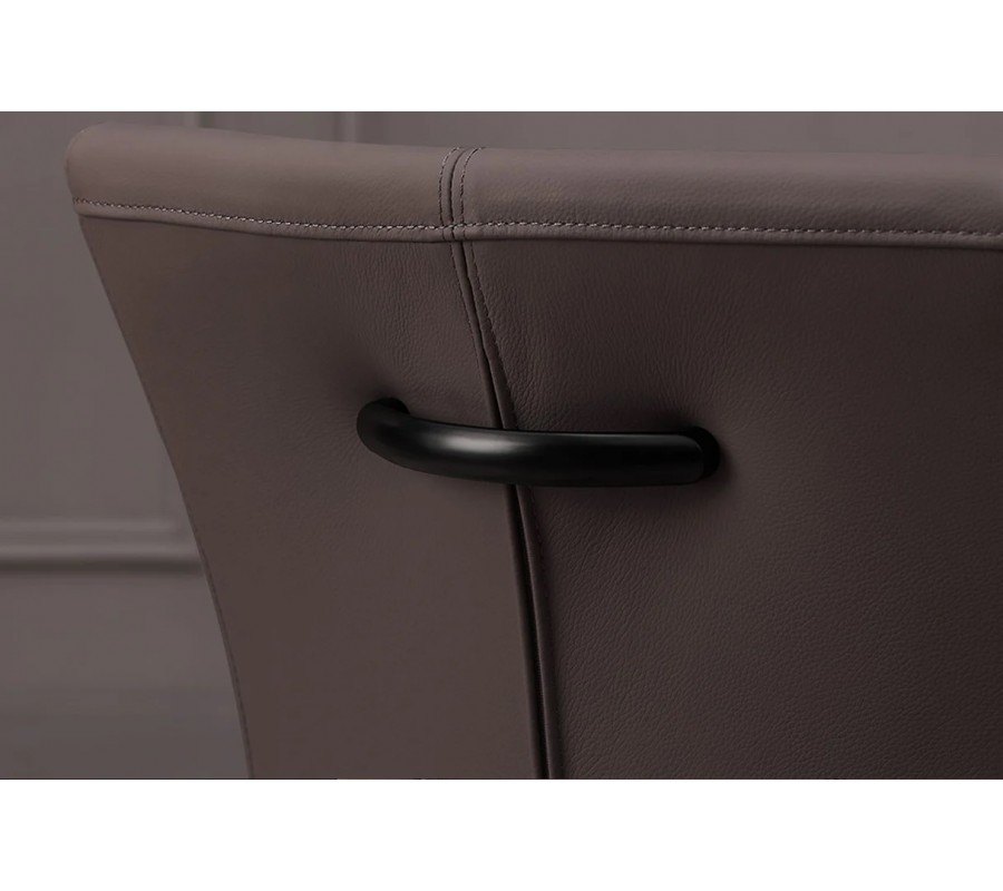 Sedadlo má obdélníkový tvar, doplněný v zadní části o vysokou zádovou opěrku. Její tvar je zakřivený a na zadní straně se nachází minimalistická kovová úchytka, která má dekorační charakter a zároveň usnadňuje manipulaci se židlí. Potah je vyroben z pravé kůže v sofistikovaném odstínu taupu, kombinujícím hnědé a šedé tóny. Hladký broušený povrch je příjemný na dotek a středem opěrky a sedadla prochází jedna prošívaná linie.