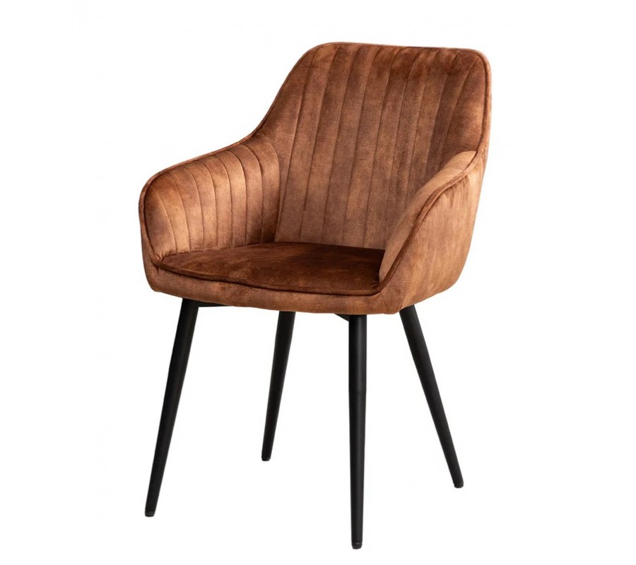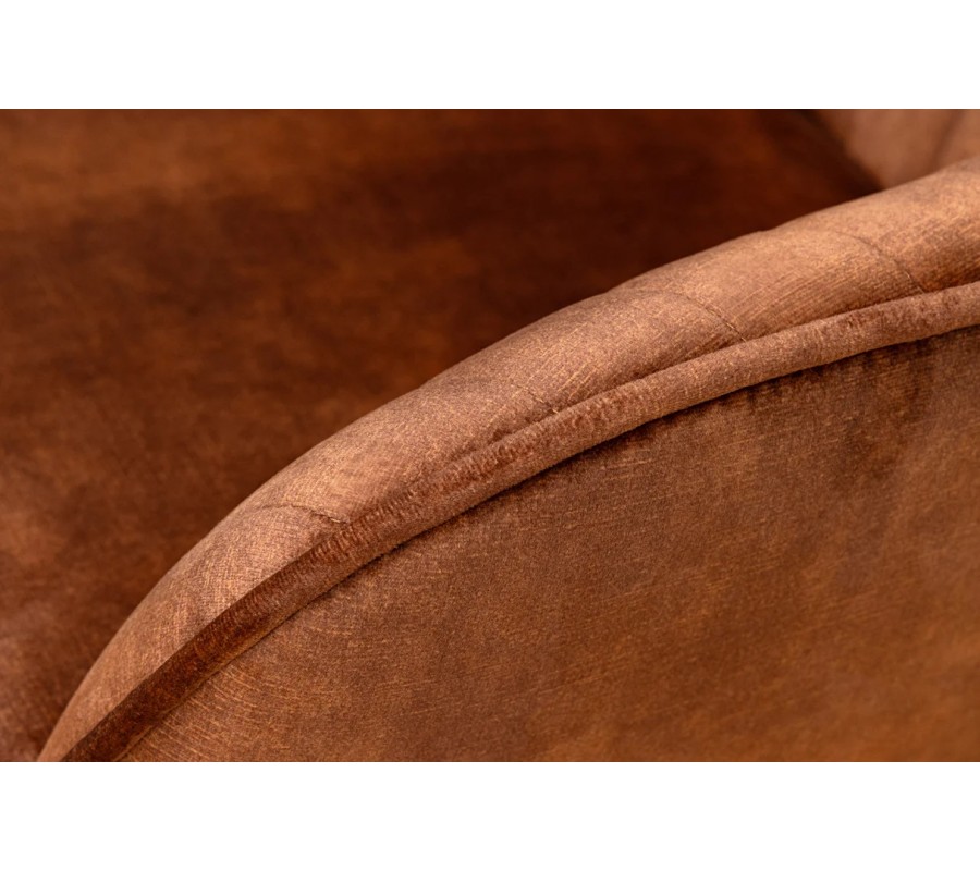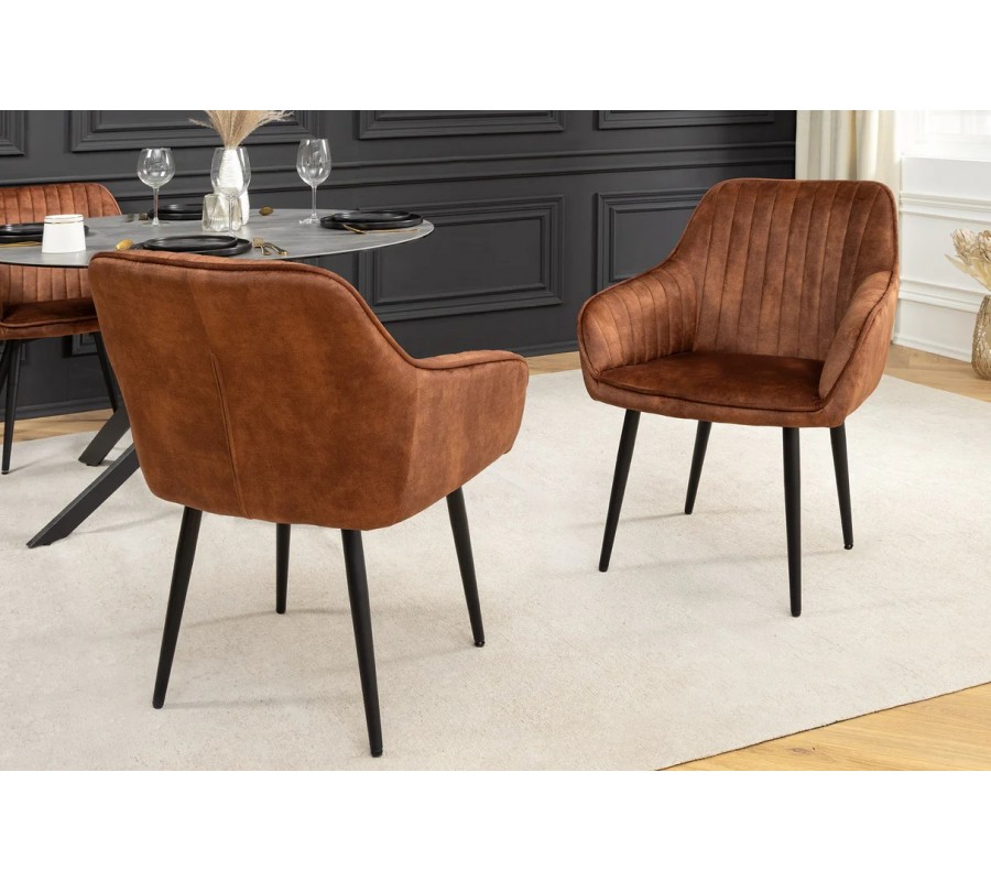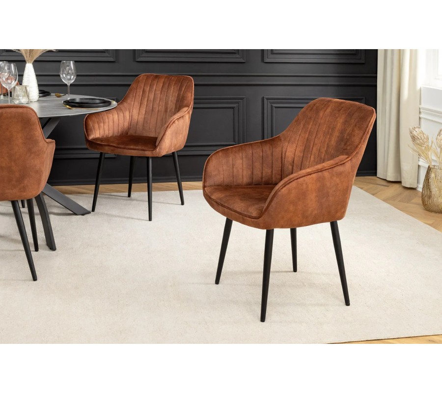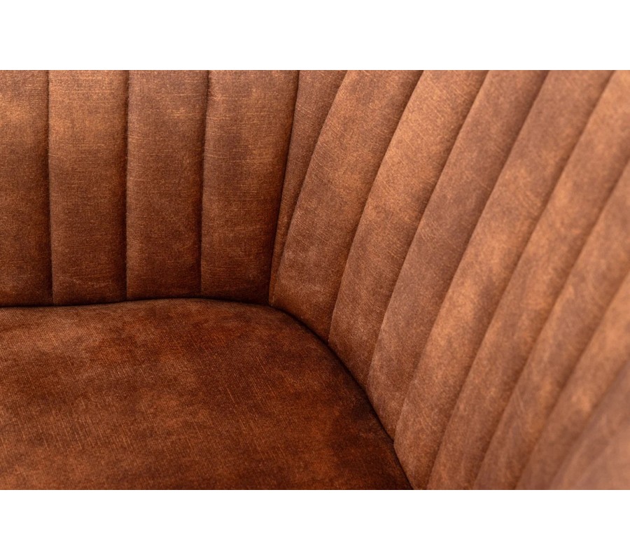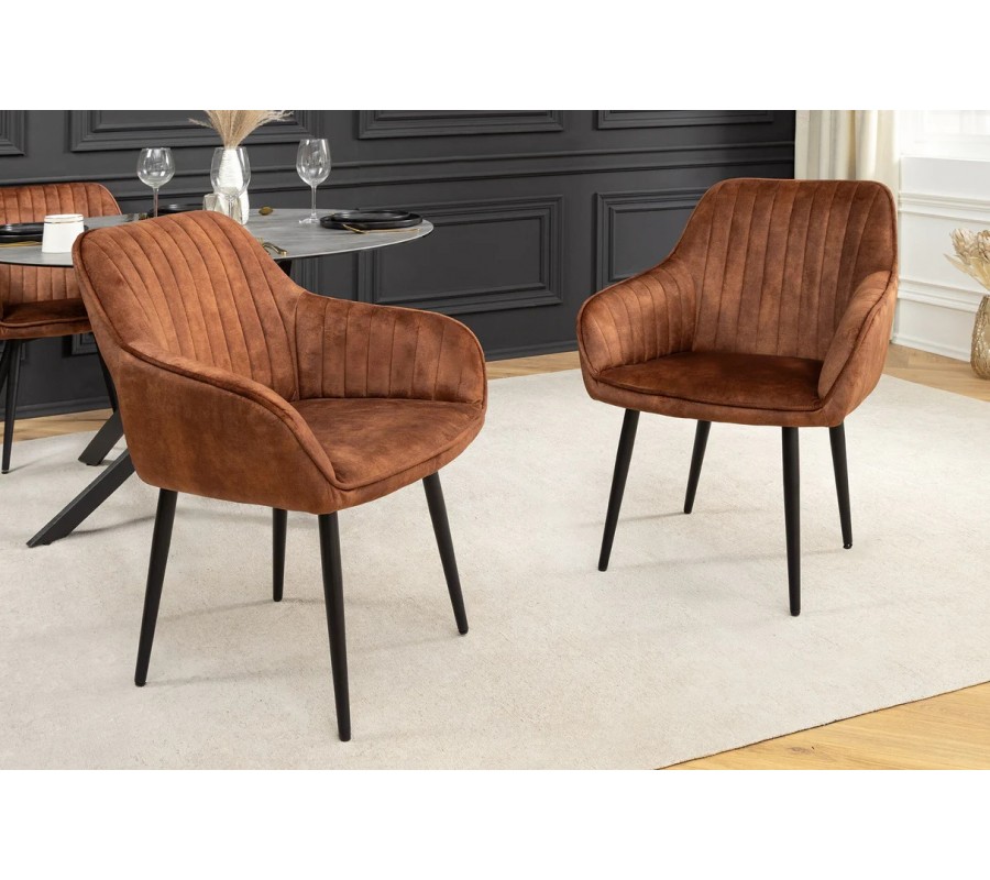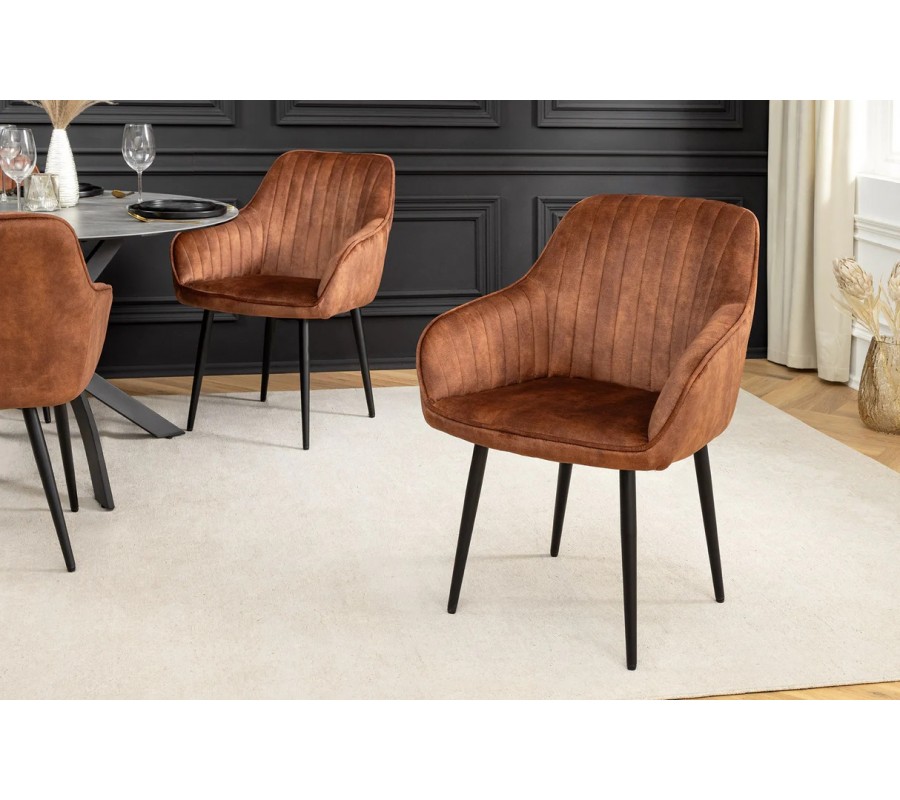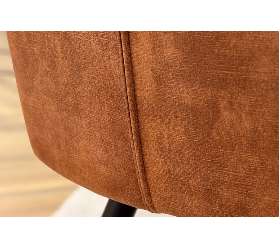 Jídelní židle má obdélníkové sedátko, které v zadní části doplňuje vysoká zádová opěrka, plynule přecházející na boční strany do nižších opěrek na ruce. Lineární siluetu zaobluje pěnová výplň. Potah z mikrovlákna je pevný a mimořádně odolný vůči vlivům každodenního používání. Sametový finiš je příjemný na dotek a dodává rezové hnědé barvě jemný lesk. Vnitřní strany opěrek zdobí minimalistické vertikální prošívání, zdůrazňující moderní vizuál.