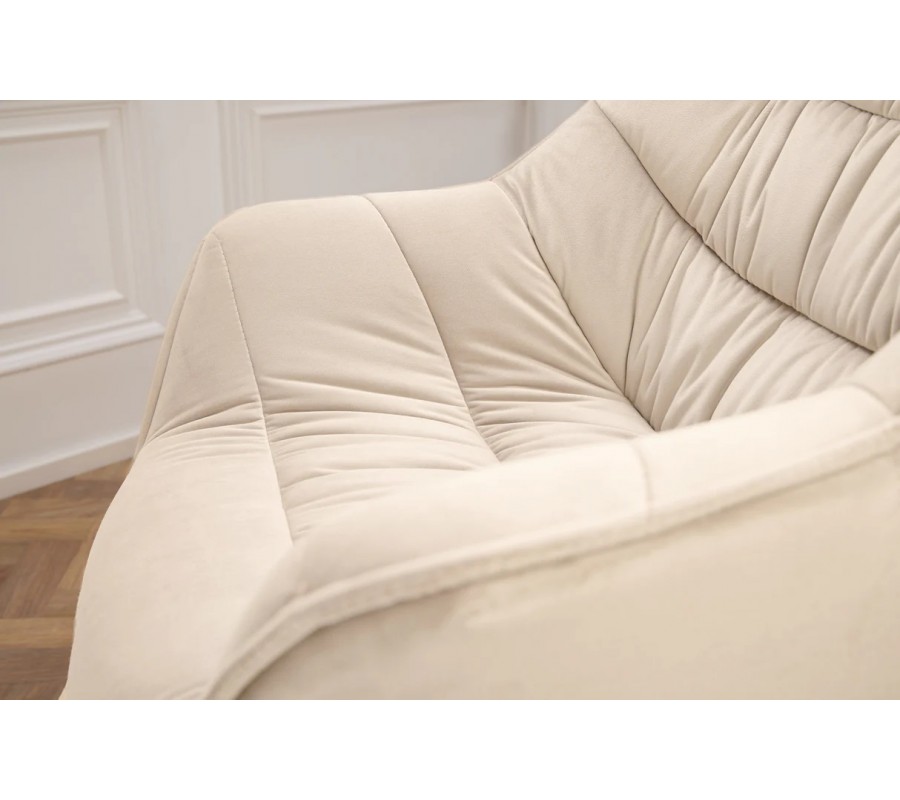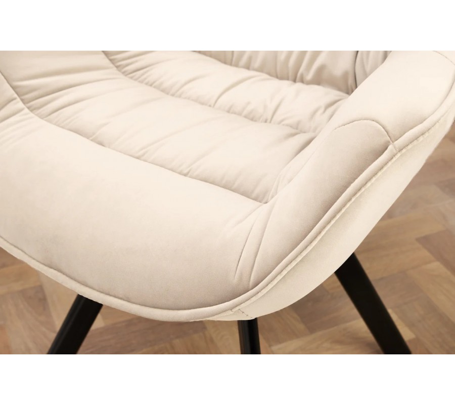 Designová otočná jídelní židle Monzana v elegantní šampaňské béžové barvě je stylovým a pohodlným řešením pro moderní interiéry. Židle je čalouněna jemným sametovým potahem, který působí luxusně a je příjemný na dotek. Vnitřní strana sedáku a opěrky zad je doplněna o horizontální prošívání s jemným řasením, které dodává židli měkký, útulný vzhled a zároveň zvyšuje komfort při sezení.