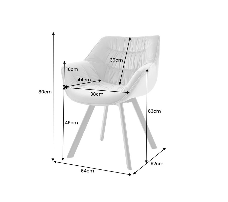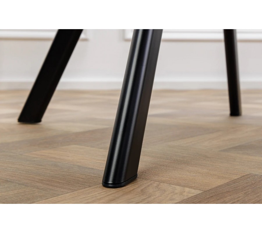 Praktickou výhodou je možnost otočení o 180 stupňů, díky čemuž je židle ideální pro každodenní používání u jídelního stolu i při delším sezení. Stabilitu zajišťují úzké hranaté kovové nožičky v černé barvě, které jsou mírně vyosené a dodávají židli moderní industriální charakter, přičemž zároveň působí lehce a elegantně.
