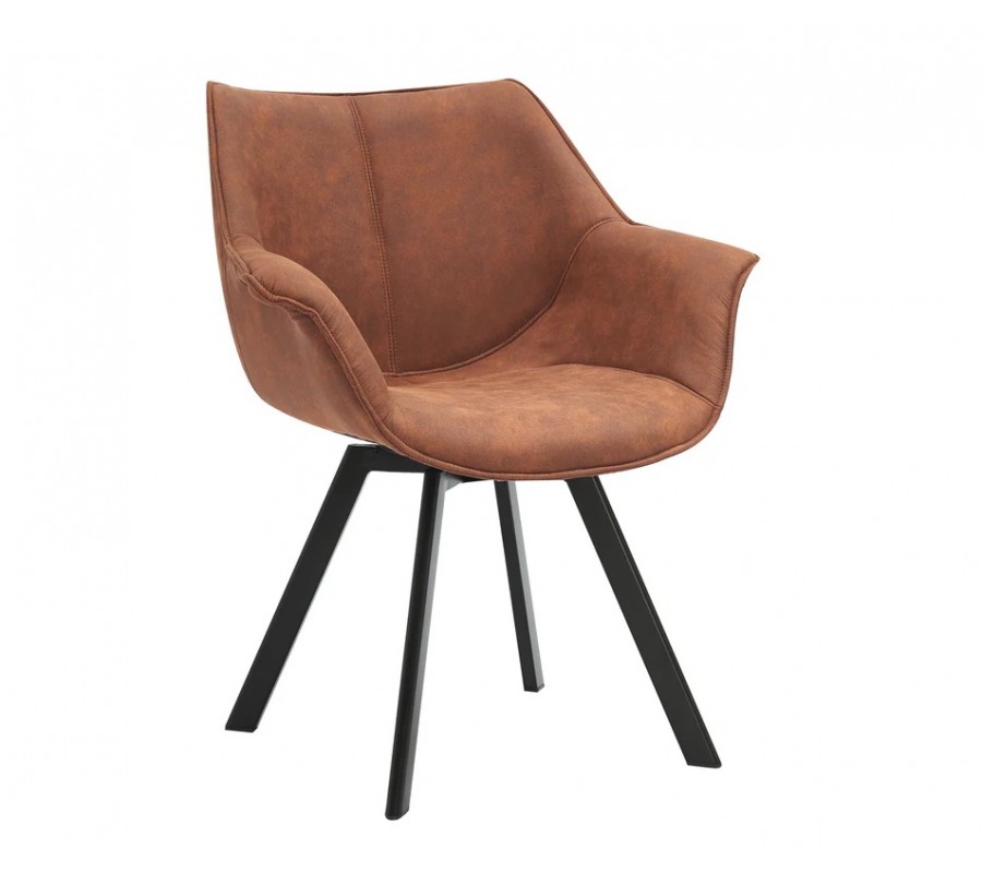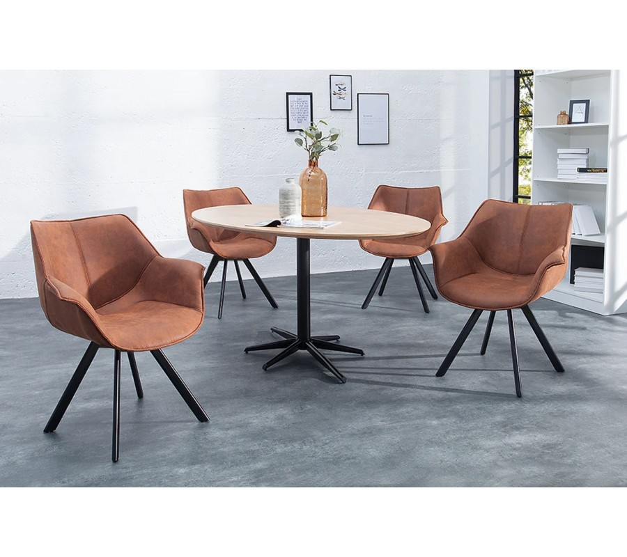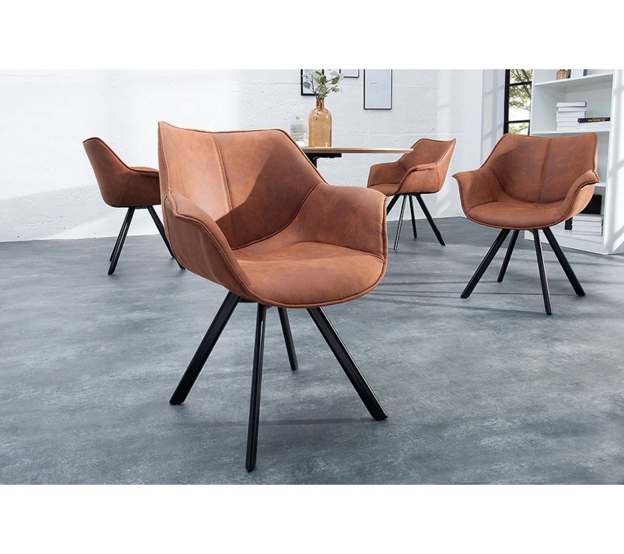 stolička má mírně vytočené boční opěrky směrem ven, které působí uvolněně a zároveň poskytují komfortní oporu. Praktickou funkcí je otočný mechanismus o 180°, který zvyšuje flexibilitu při používání u jídelního stolu i při delším sezení. Stabilitu zajišťují černé kovové nožičky, které jsou ploché, hranaté a mírně vyosené, přičemž vycházejí ze středu pod sedadlem. Tento detail vytváří výrazný industriální kontrast k teplému vintage hnědému čalounění.