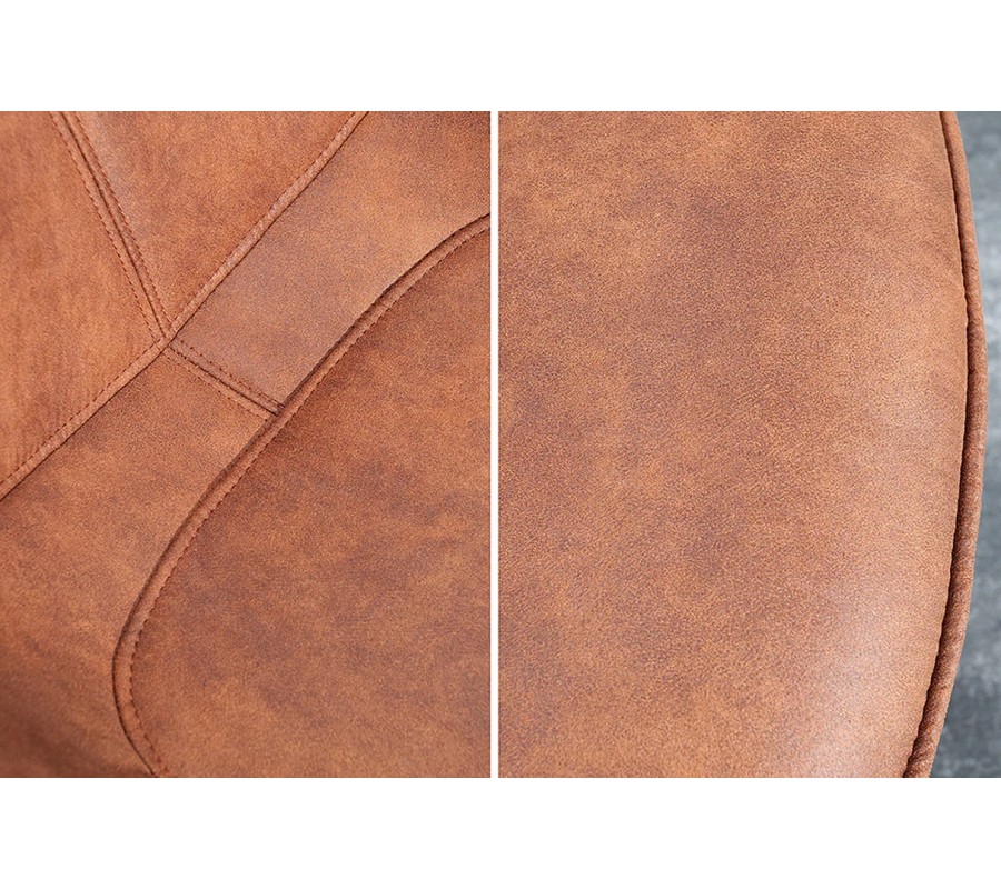 Designová industriální otočná jídelní židle Monzana ve vintage hnědé barvě je stylovým a pohodlným řešením pro moderní i loftové interiéry. Židle je čalouněna eko kůží z kvalitního mikrovlákna se semišovým povrchem, který má charakteristický vzhled vintage kůže, je příjemný na dotek a zároveň praktický na údržbu. Výrazným designovým prvkem jsou prošívané lemy a tvarované prošívání sedáku, které dodávají židli strukturu, vizuální hloubku a podtrhují její industriální charakter. Čalounění je měkké a ergonomicky tvarované pro pohodlné sezení.