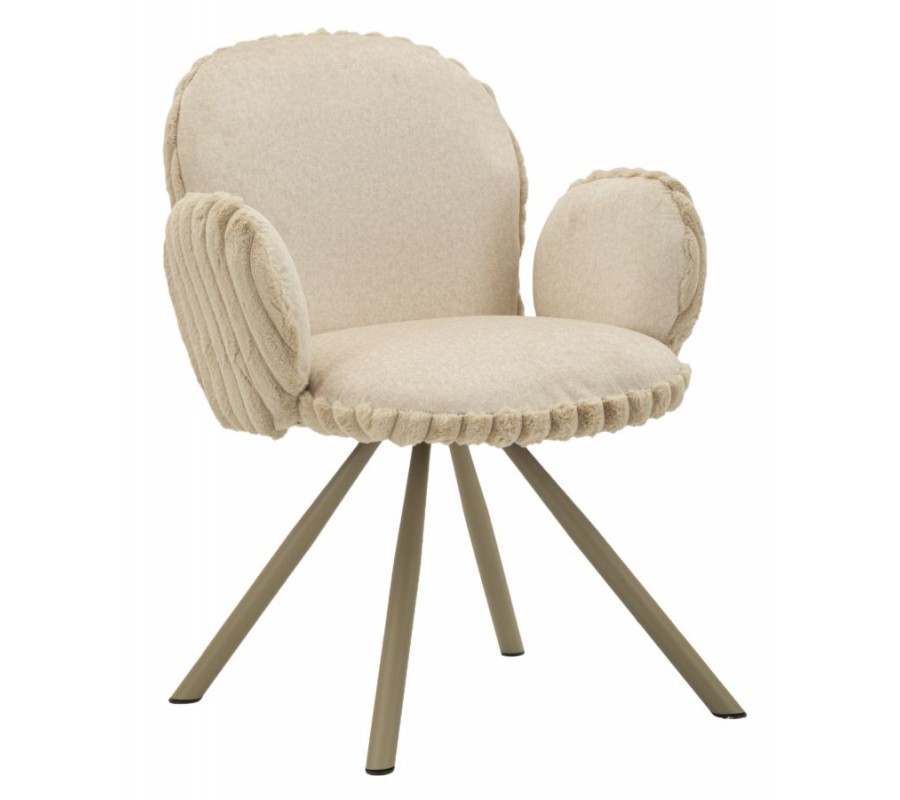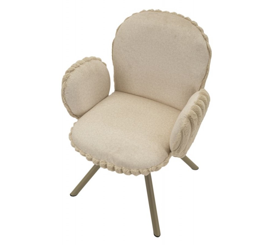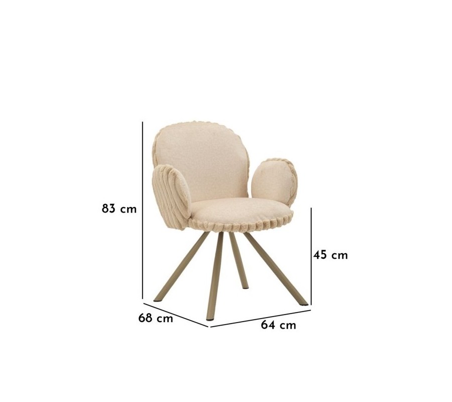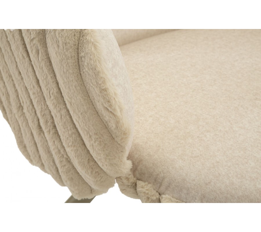 Stolička je čalúnená hebkým plyšovým poťahom v béžovom odtieni, ktorý prináša vysoký komfort pri sedení a zároveň vizuálnu mäkkosť. Zadná časť opierky a bočných opierok je zdobená dekoratívnym vrúbkovaným prešívaním, ktoré dodáva stoličke jemný dizajnový akcent. Zaoblené opierka zad poskytuje pohodlnú oporu, zatiaľ čo nízke oblé bočné opierky v zaoblenom tvare sú samostatne tvarované a nedotýkajú sa opierky, čo stoličke dodáva ľahký a originálny vzhľad.