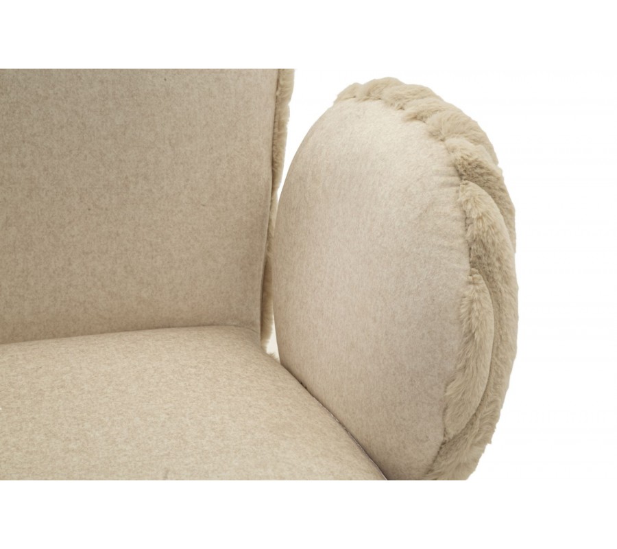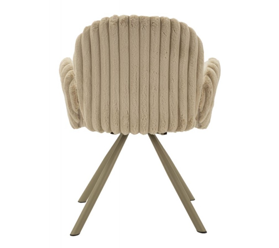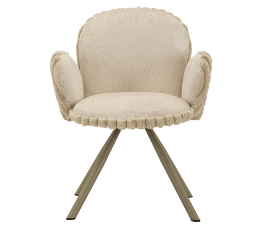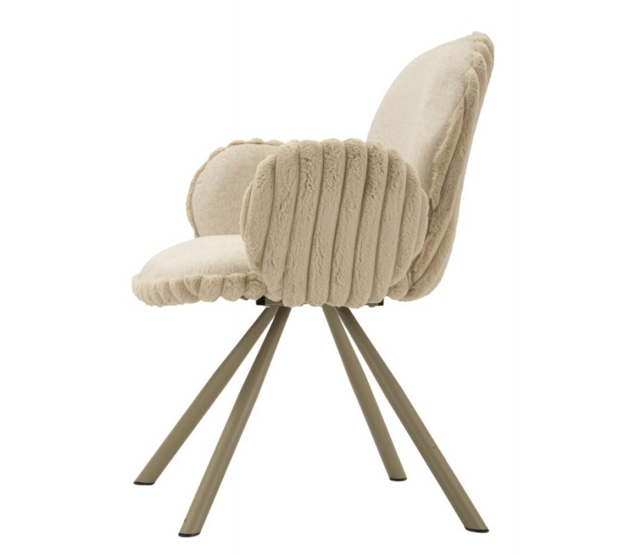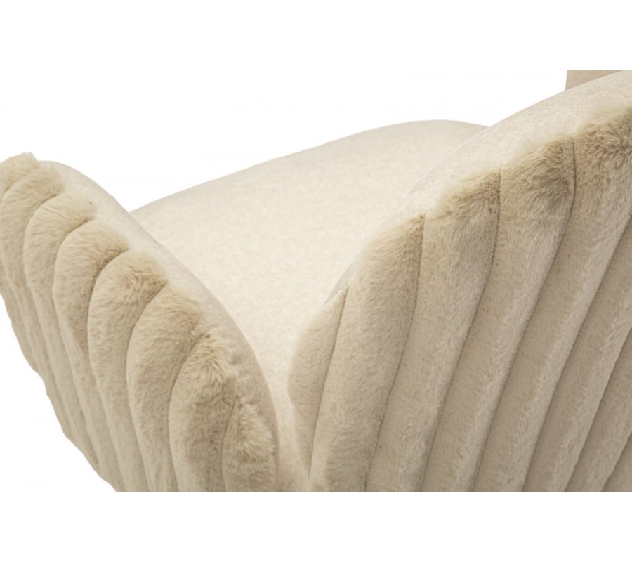 Stolička je čalúnená hebkým plyšovým poťahom v béžovom odtieni, ktorý prináša vysoký komfort pri sedení a zároveň vizuálnu mäkkosť. Zadná časť opierky a bočných opierok je zdobená dekoratívnym vrúbkovaným prešívaním, ktoré dodáva stoličke jemný dizajnový akcent. Zaoblené opierka zad poskytuje pohodlnú oporu, zatiaľ čo nízke oblé bočné opierky v zaoblenom tvare sú samostatne tvarované a nedotýkajú sa opierky, čo stoličke dodáva ľahký a originálny vzhľad.