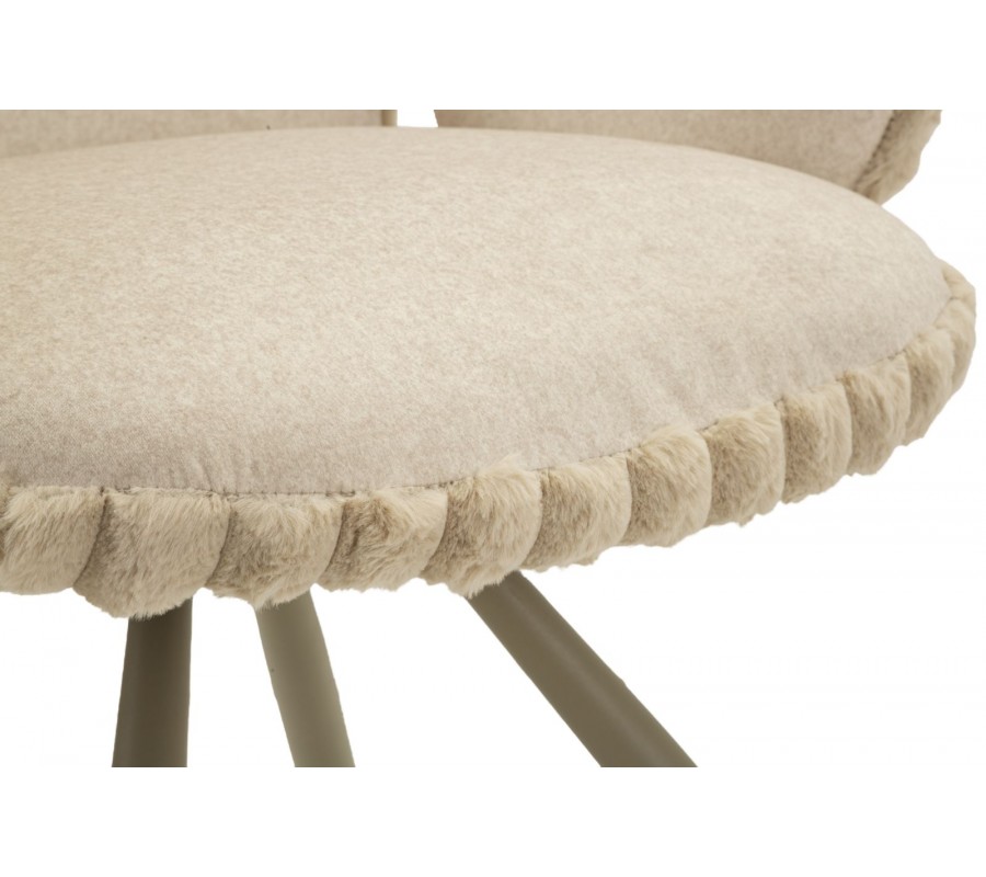 Zo stredu pod sedadlom vychádzajú štyri mírne vyosené kovové nožičky v hnedo-béžovej farbe, ktoré farebne ladia s čalúnením a podčiarkujú elegantný, prírodne ladený charakter stoličky. Celkový dizajn pôsobí vyvážene, stabilne a vizuálne veľmi príjemne.