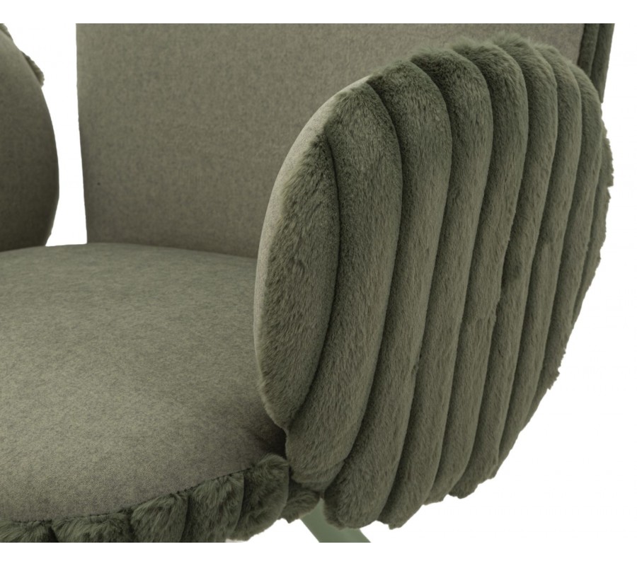 Stolička je potiahnutá príjemným plyšovým poťahom v zelenom odtieni. Zadná časť opierky a bočných opierok je doplnená o dekoratívne vrúbkované prešívanie, ktoré zvýrazňuje jej dizajnový charakter. Zaoblené opierka zad poskytuje komfortnú oporu, zatiaľ čo nízke bočné opierky v zaoblenom tvare sú samostatne tvarované a nedotýkajú sa opierky, čím vytvárajú zaujímavý vizuálny detail a dodávajú stoličke ľahkosť a originalitu.