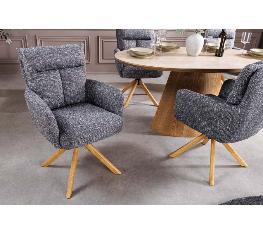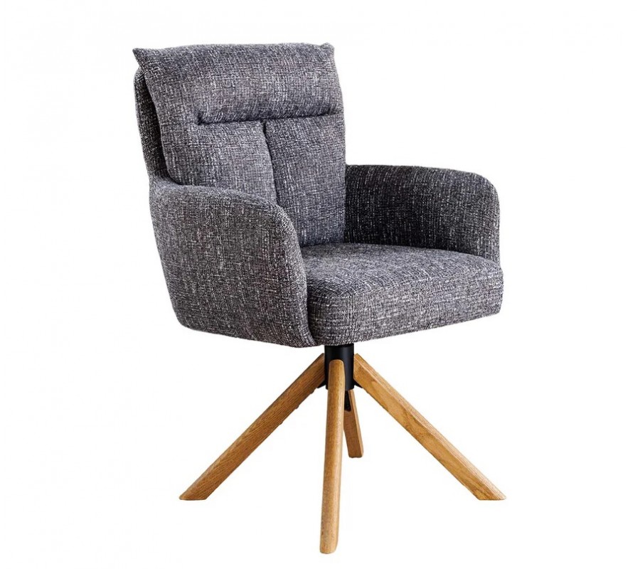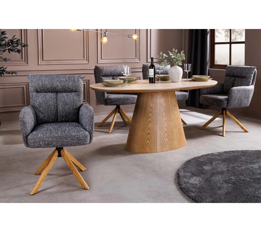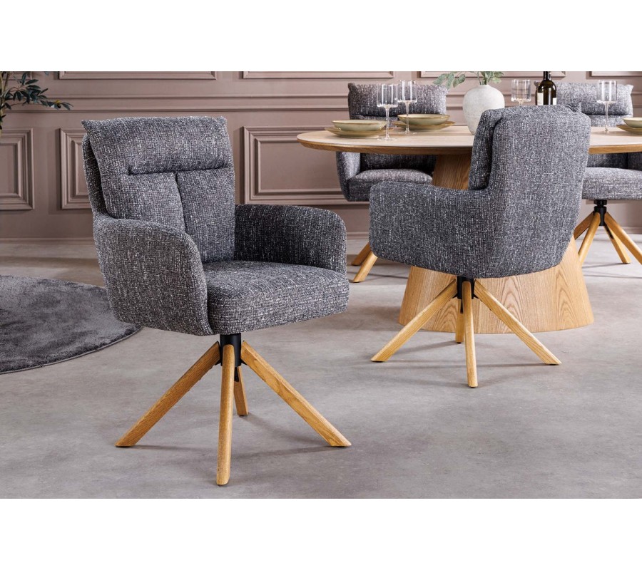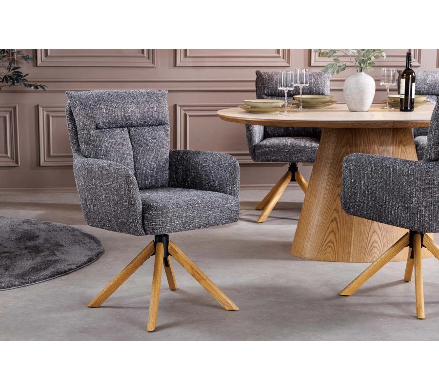Moderní otočná čalouněná jídelní židle Dover spojuje pohodlí, funkčnost a nadčasový design s jemným retro nádechem. Židle stojí na stabilní čtyřramenné podnoži z masivního dřeva v dubově hnědém odstínu, přičemž nožičky vycházejí ze středu pod sedadlem a vytvářejí lehký, vzdušný vizuál. Otočný mechanismus umožňuje otáčení o 360 stupňů, což zvyšuje komfort při sezení u jídelního stolu i v pracovním prostoru.