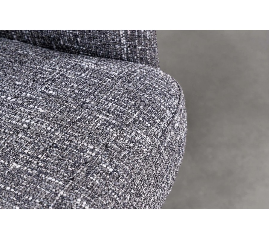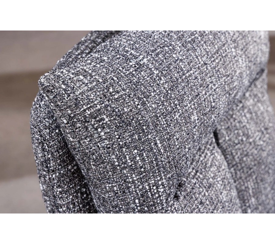 Sedadlo je čalouněno melírovaným žinylkovým potahem v šedo-bílé barevnosti, který působí elegantně, moderně a je příjemný na dotek. Užší boční opěrky plynule přecházejí do opěrky zad, čímž vytvářejí kompaktní a ergonomický tvar. Páteřová opěrka je doplněna čtvercovým polštářem, který poskytuje dodatečnou oporu a zvyšuje komfort při delším sezení.