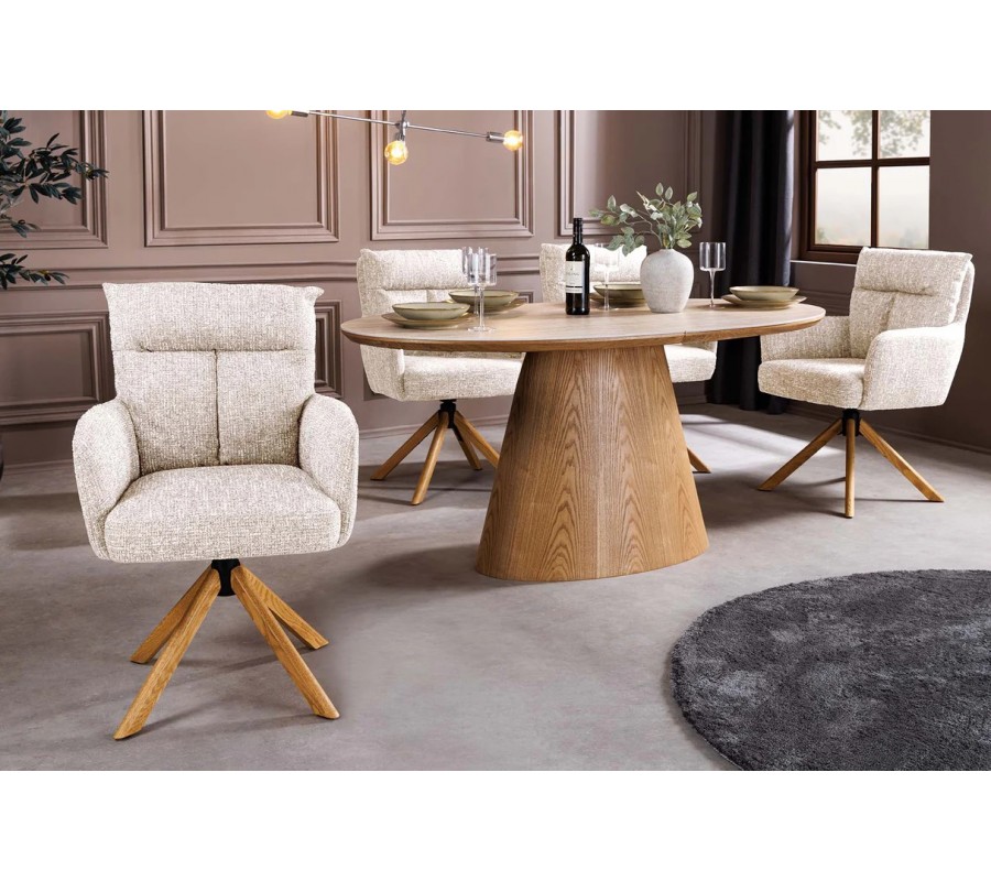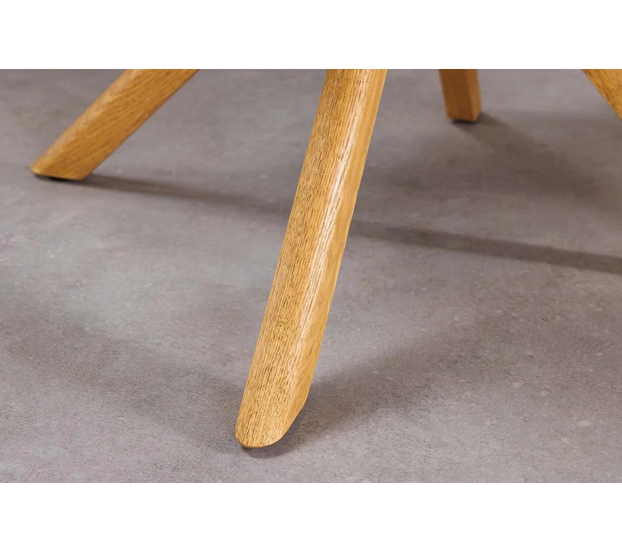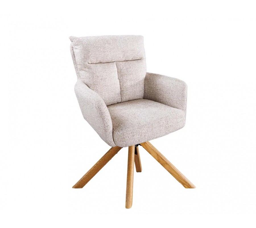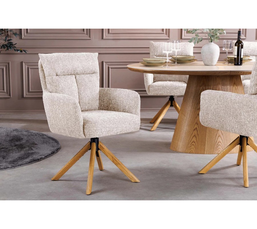 Moderní otočná čalouněná jídelní židle Dover v béžovém provedení spojuje nadčasový design, vysoký komfort a praktickou funkčnost. Židle stojí na stabilní čtyřramenné podnoži z masivního dubového dřeva v teplém dubově hnědém odstínu, přičemž nožičky vycházejí ze středu pod sedadlem a dodávají celku lehký, jemně retro charakter. Otočný mechanismus umožňuje otáčení o 360 stupňů a zároveň zajišťuje automatický návrat sedadla do původní polohy, což je mimořádně praktické při používání v jídelně.