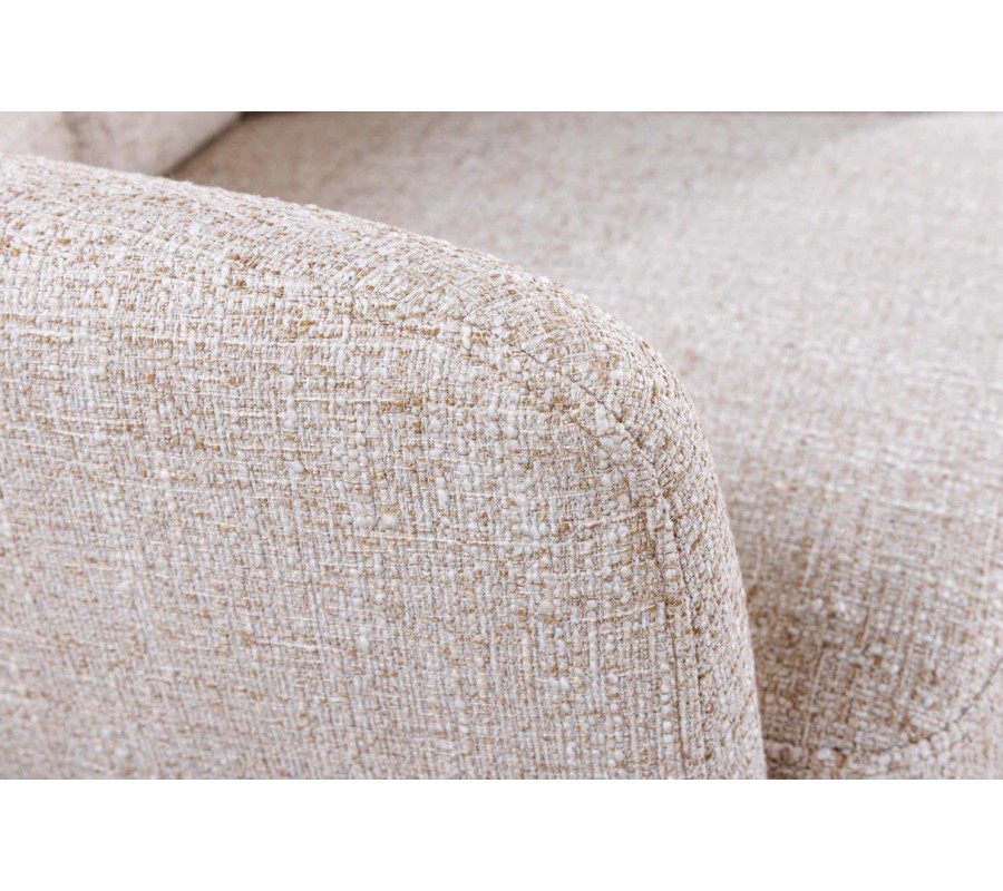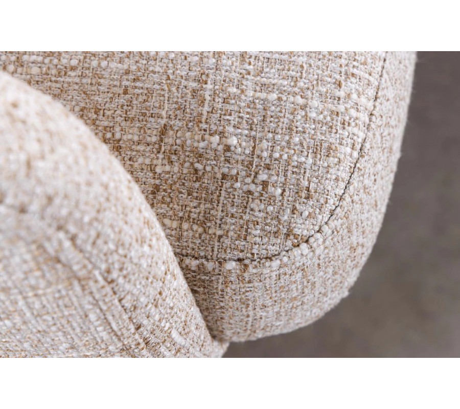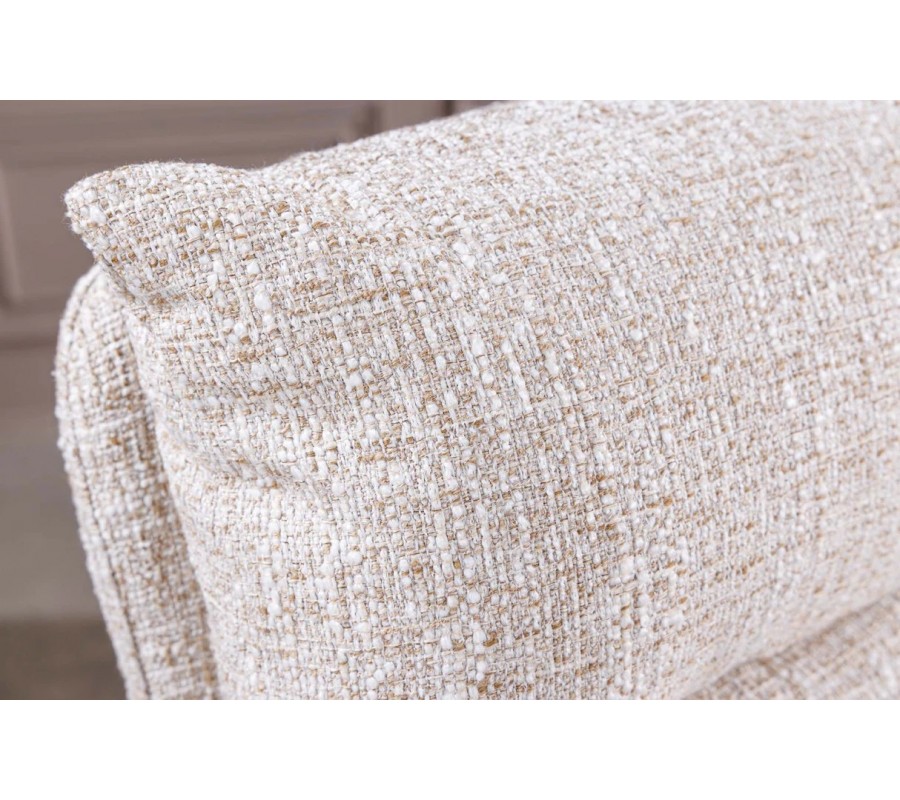 Sedák je čalouněný a potažený kvalitní ženilkovou látkou v jemném béžovém odstínu, která působí elegantně, je příjemná na dotek a snadno se kombinuje s ostatním zařízením interiéru. Užší boční opěrky plynule navazují na opěrku zad. Zádová opěrka je doplněna čtvercovým polštářem, který je pevně připevněn k opěrce, poskytuje dodatečnou oporu a zvyšuje komfort i při delším sezení.