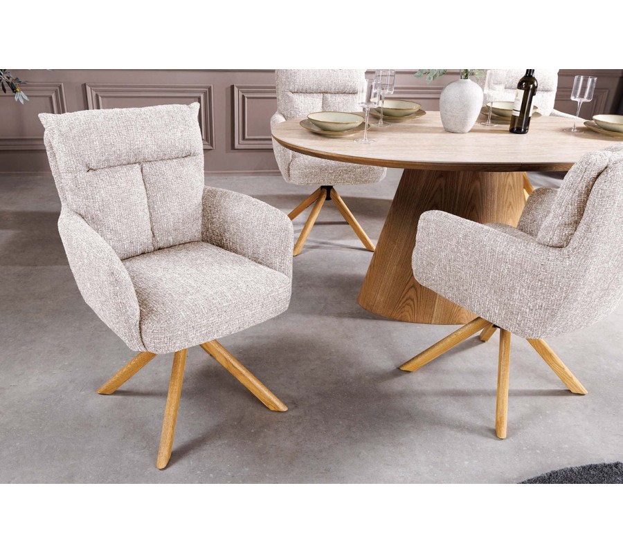 Moderní otočná jídelní židle Dover v béžové barvě s žinylkovým potahem s hnědými dubovými nožičkami 92 cm