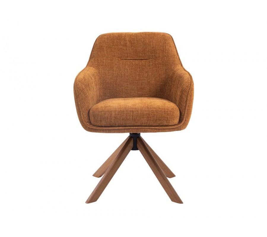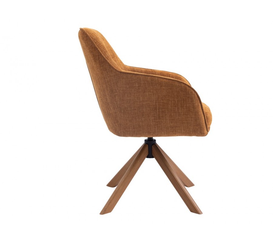 Židle doplňují čtyři nohy vyrobené z masivního dubového dřeva v přírodní hnědé barvě. V horní části je nenápadně integrován otočný mechanismus sedáku a sešikmený tvar nohou dodává designu dynamiku, přičemž zároveň zajišťuje dobrou stabilitu.