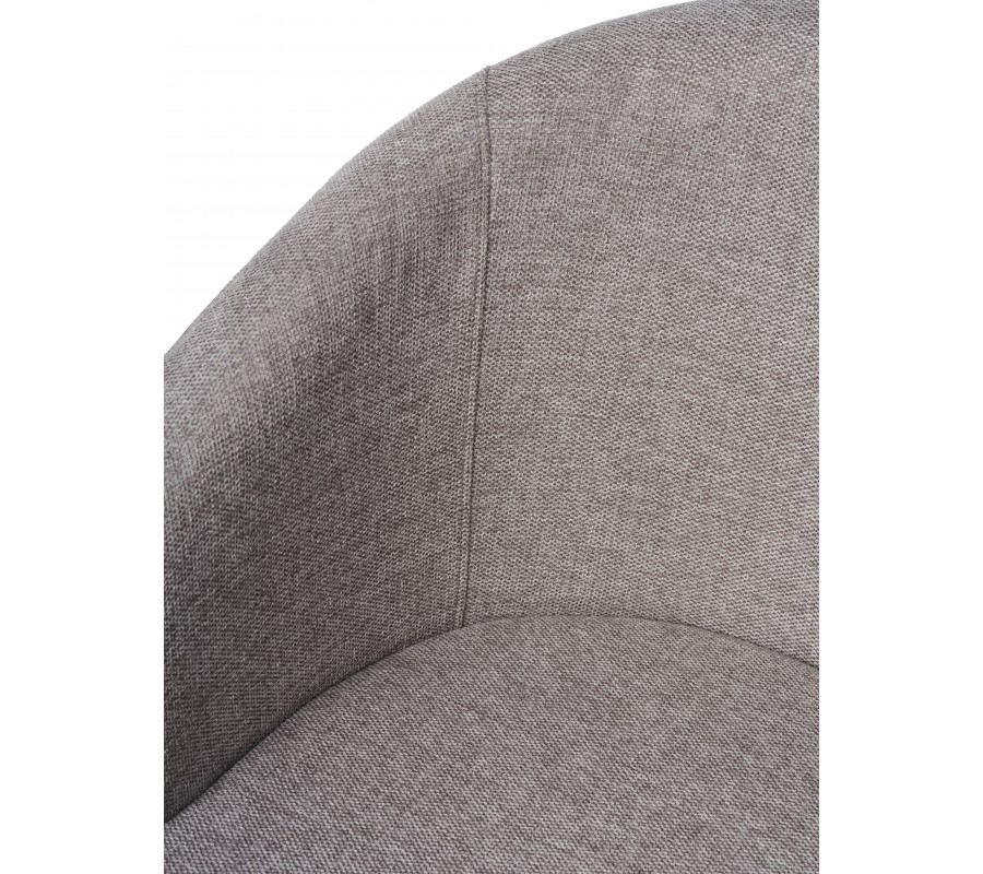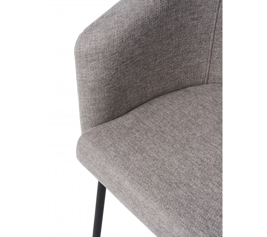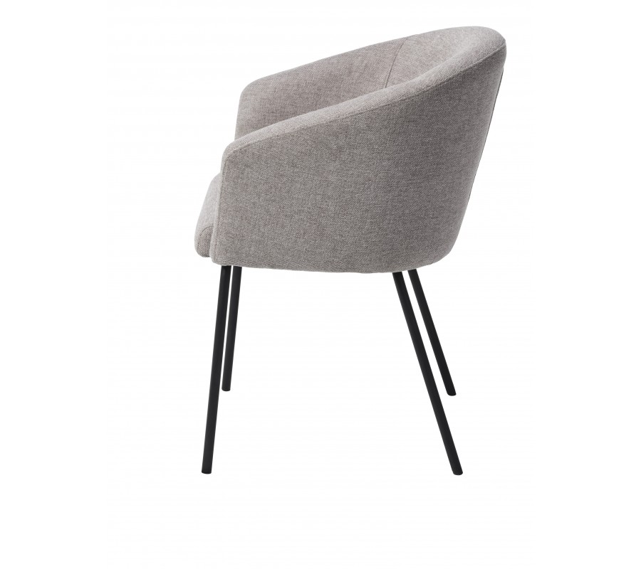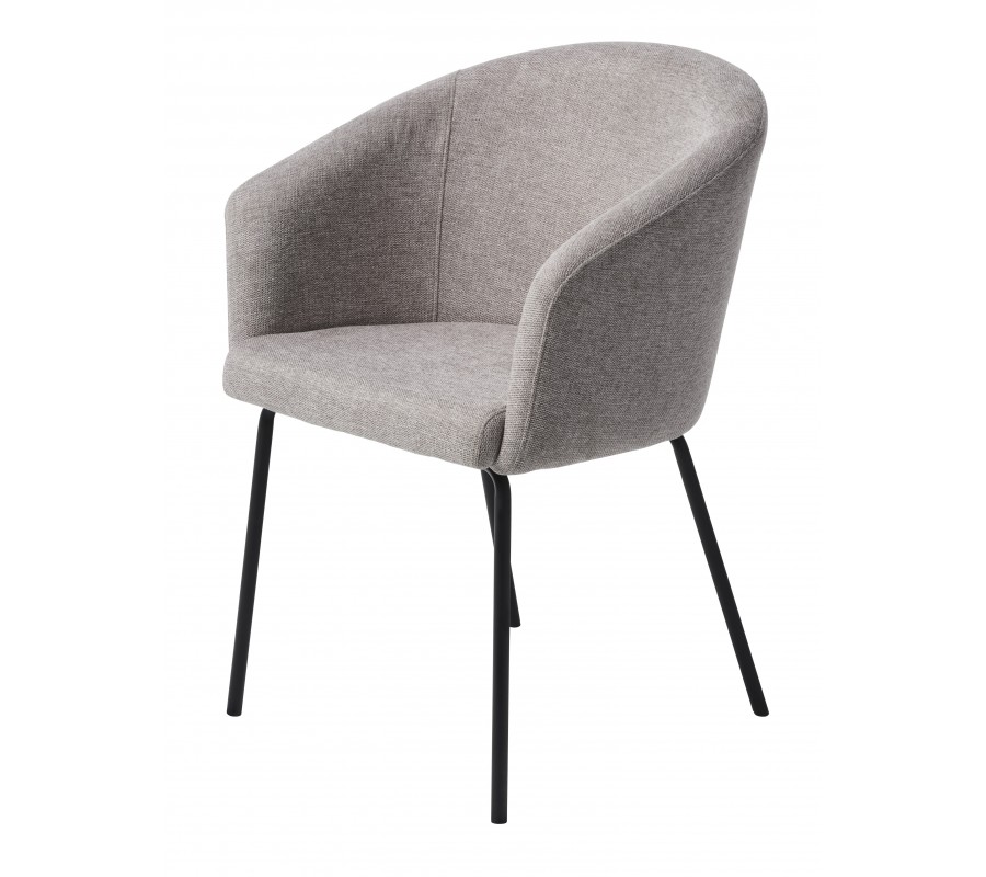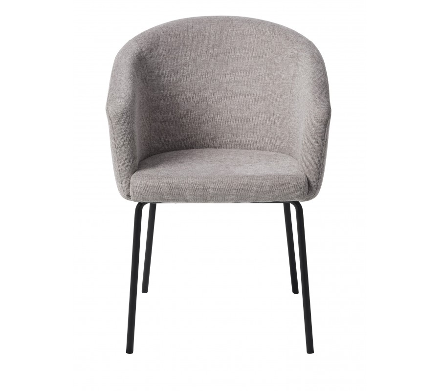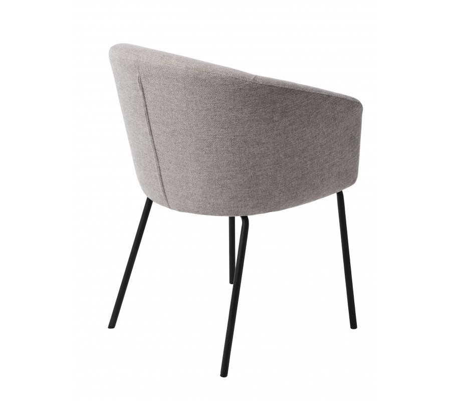Dominantou židle je robustní sedací část s opěrkou ve tvaru písmene U. Ta je v zadní části nejvyšší a směrem k bokům se jemně snižuje až do podoby opěrek na ruce. Měkké pěnové čalounění zvýrazňuje zaoblené linie a zvyšuje pohodlí při sezení. Nožičky mají štíhlý válcovitý tvar, který v kombinaci s barvou potahu opticky odlehčuje horní část a vytváří k ní estetický kontrast. Jejich mírné šikmé osazení zároveň přispívá ke stabilitě.