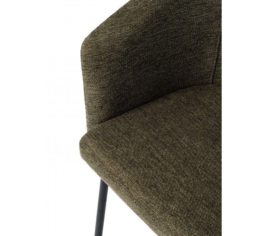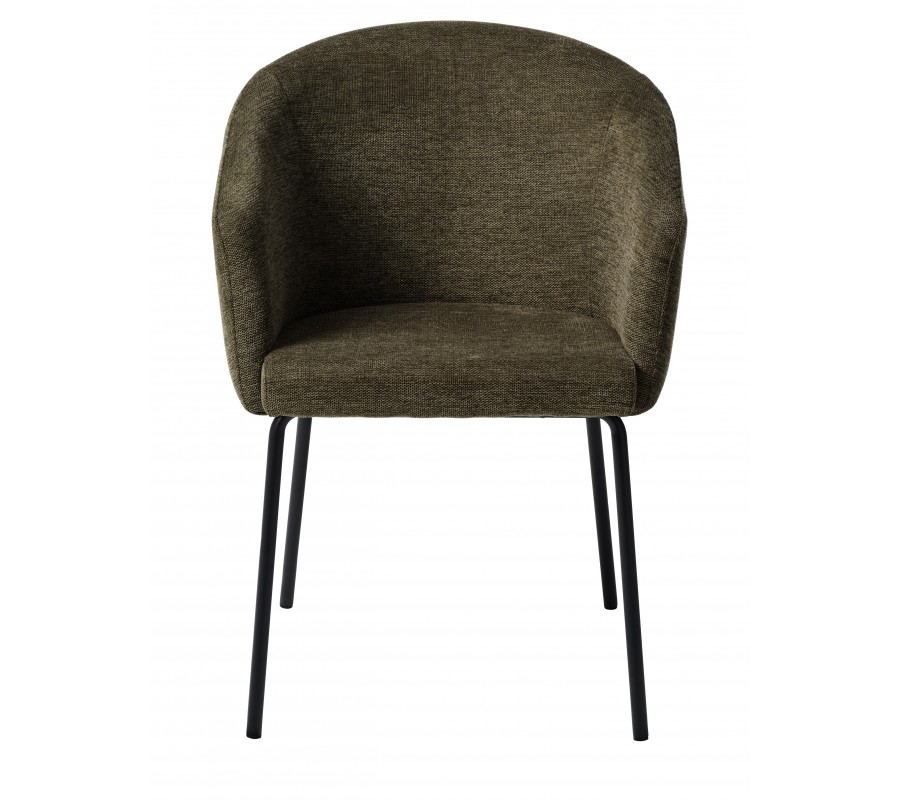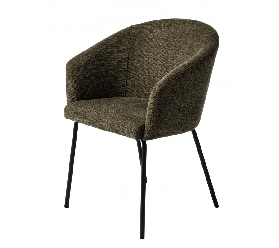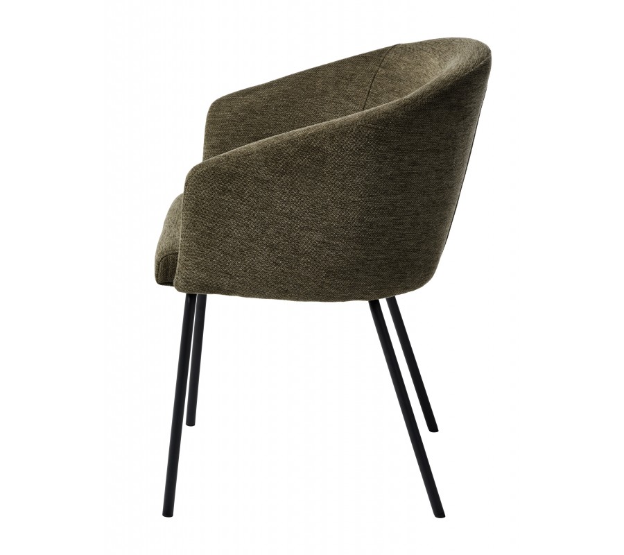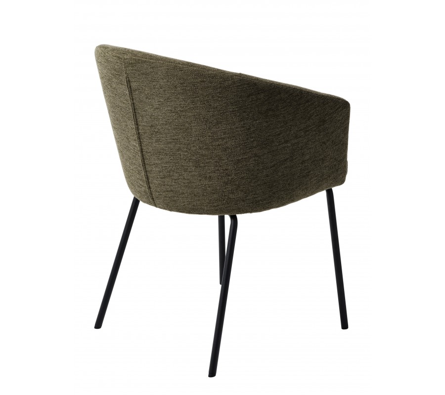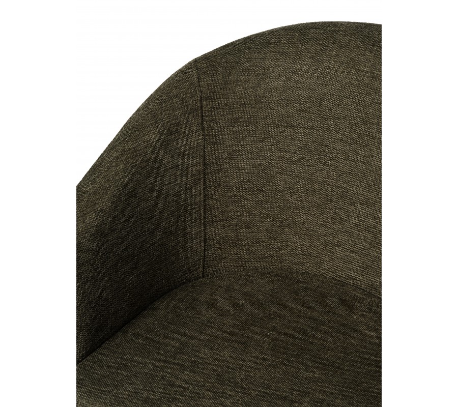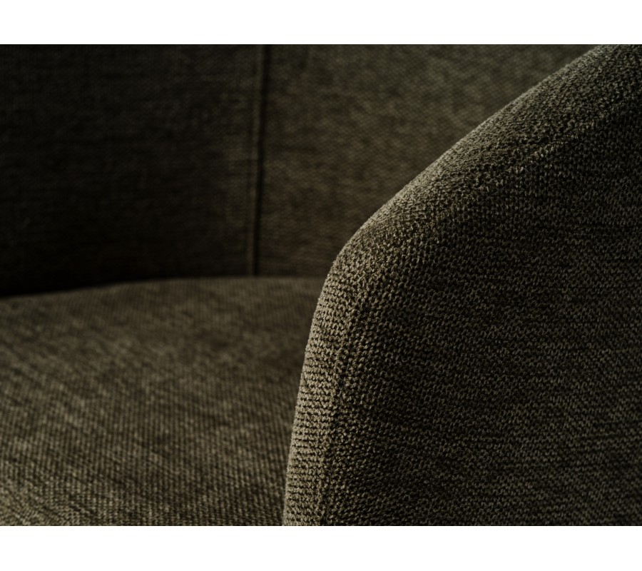 Čalounění sedadla i opěradla zvýrazňuje měkké, zaoblené linie. Potah v odstínu olivové zelené přináší přírodní zemitý akcent. Jemné melírování podtrhuje hladkou, na dotek příjemnou texturu látky. Mikrovlákno je odolné, takže si židle zachová pěkný vzhled i při každodenním intenzivním používání. Kovová podnož v černé barvě vytváří výrazný moderní kontrast.