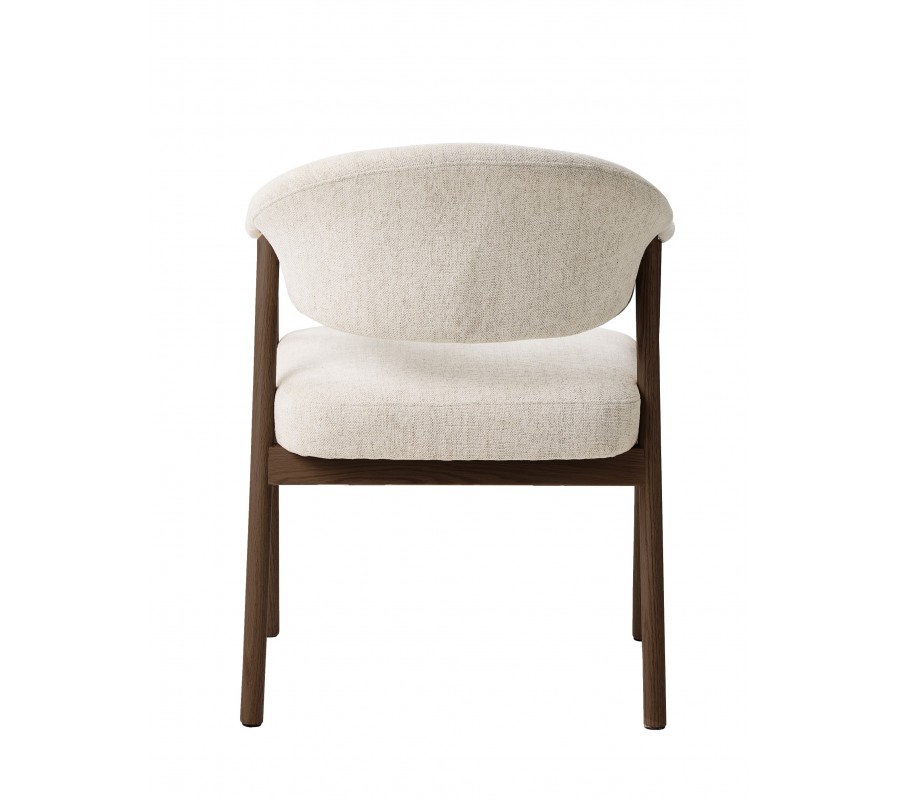 Nožičky mají válcovitý tvar, přední jsou rovné a zadní výrazně zešikmené. Jejich linie přechází až nad sedadlo, kde se napájí na zádovou opěrku, díky čemuž vzniká vzdušná a odlehčená silueta. Pod sedadlem jsou propojeny dvěma lineárními výztuhami. Provedení v tmavě hnědé barvě s přiznanou kresbou letokruhů kontrastuje s potahem a zároveň dodává nábytku harmonický přírodní charakter.