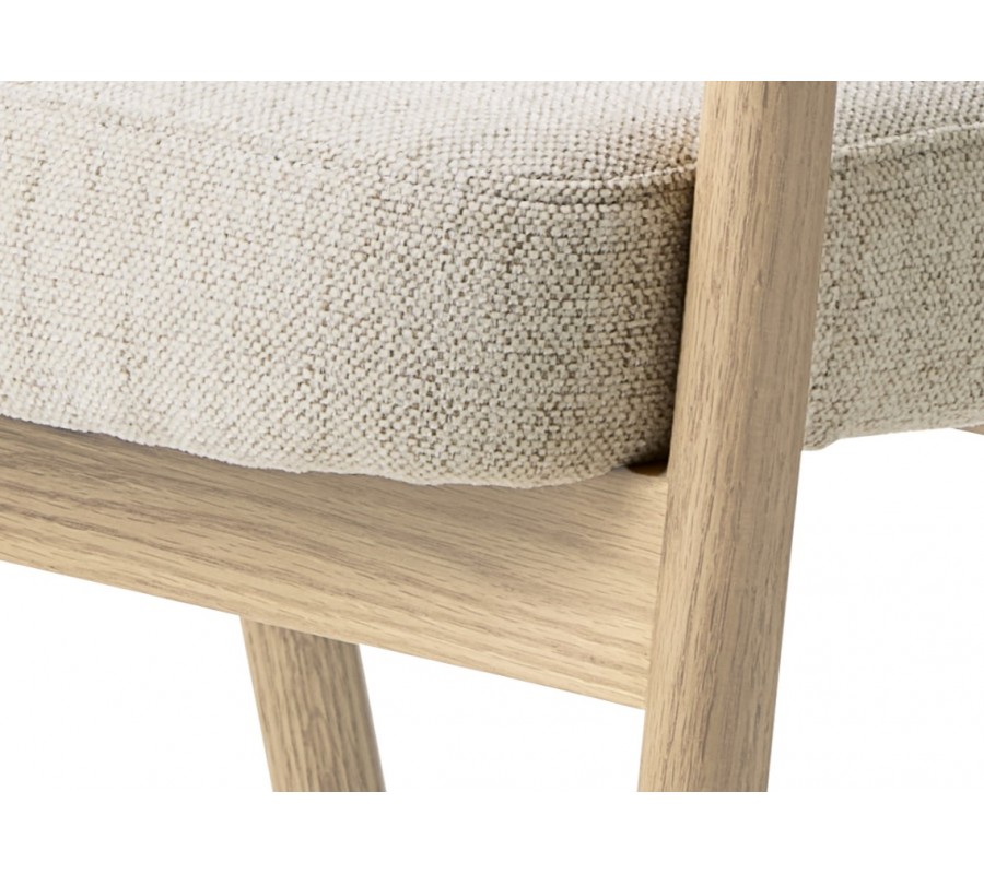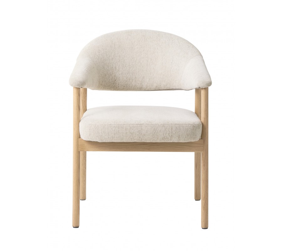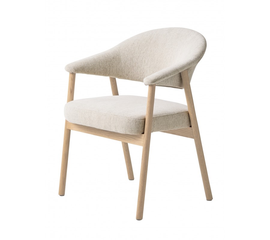 Konstrukce je vyrobena ze dřeva ve světle hnědé barvě běleného dubu, která v kombinaci s přiznanou pravidelnou kresbou letokruhů podtrhuje přírodní skandinávský charakter designu. Potah s na dotek příjemným žinylkovým finišem ve světlém krémově bílém odstínu krásně komplimentuje dřevo a dodává židli měkký hřejivý výraz. Je vyroben z mikrovlákna, díky kterému je mimořádně pevný, odolný a nenáročný na údržbu.