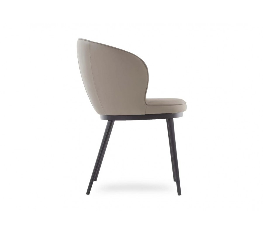 Tvar sedáku kopíruje výztuha pod ním, ke které se napojují čtyři štíhlé nožičky. Mají válcovitý, ve spodní části jemně zúžený tvar, který se výborně propojuje s oblou siluetou sedáku a zároveň ji vizuálně odlehčuje. Výrazně sešikmené linie zadní dvojice zaručí výbornou stabilitu a černé kovové provedení dodává židli jemně industriální výraz.