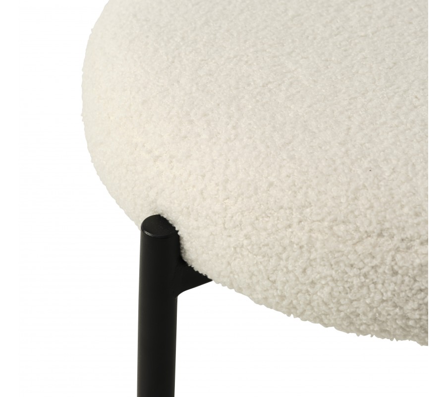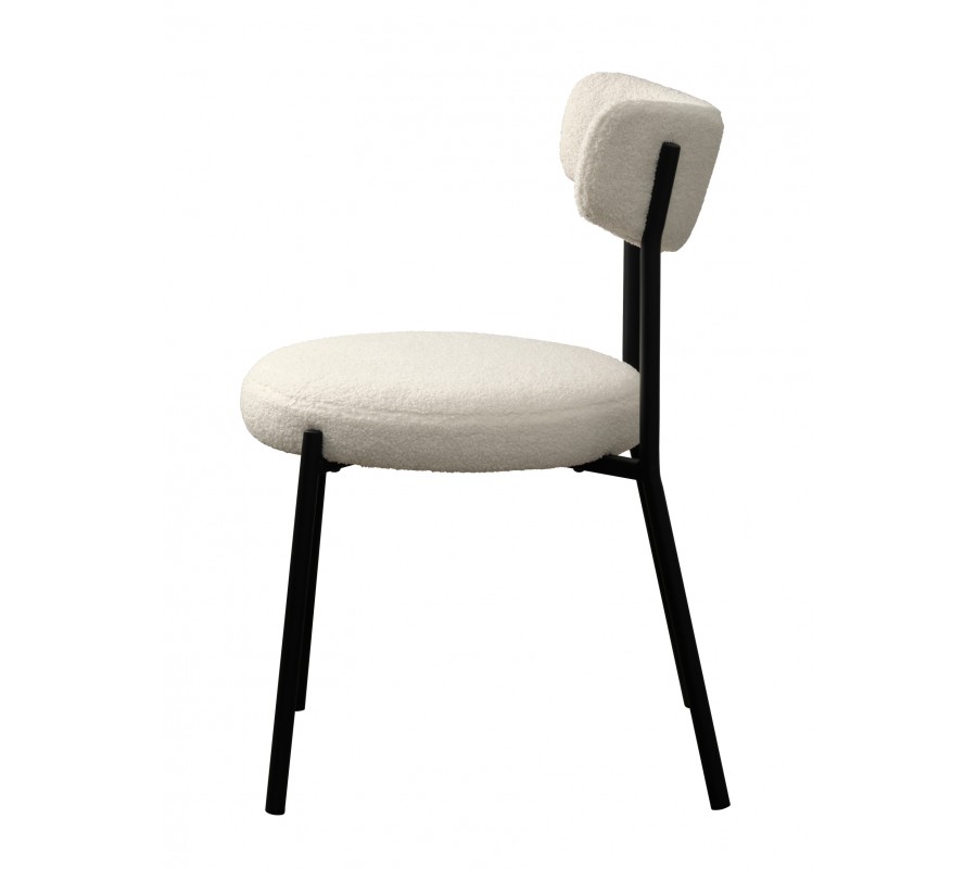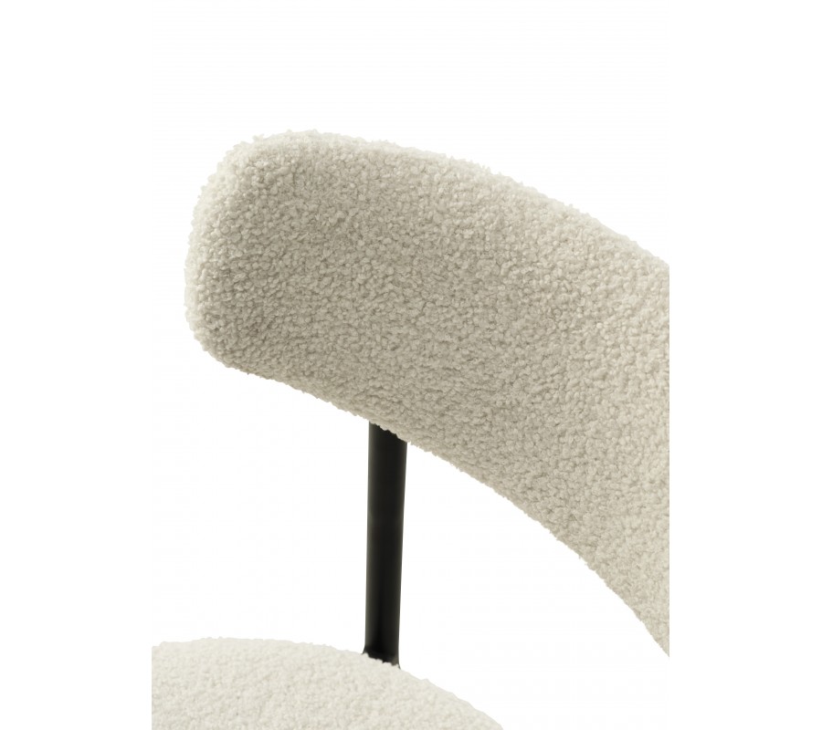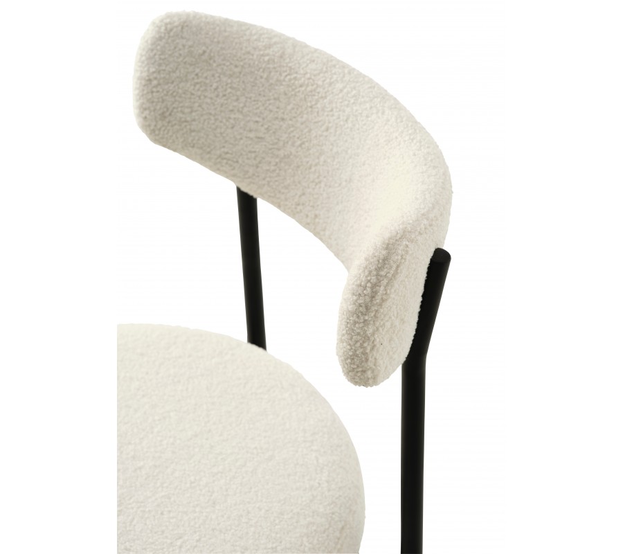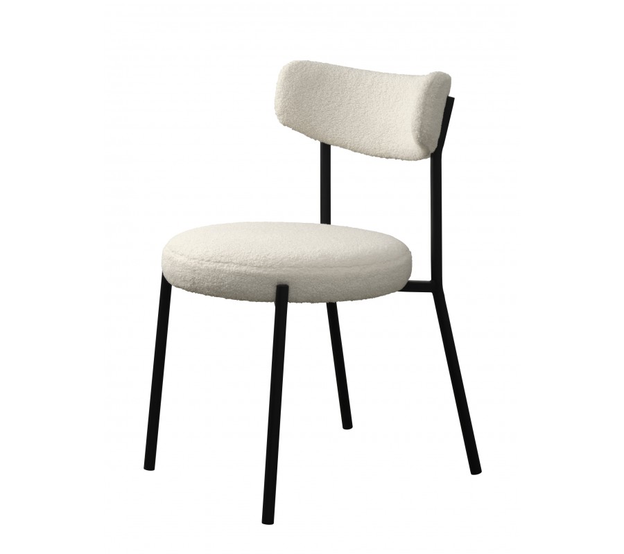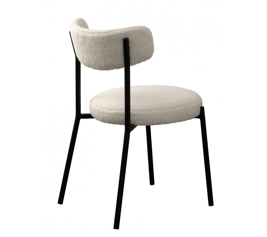 Sedadlo má kulatý tvar a doplňuje jej výrazně zakřivená zádová opěrka, která se výborně přizpůsobí tělu. Její spodní hrana je poloblouková, s nejširší částí uprostřed pro ještě větší komfort. Pěnovou výplň doplňuje buklé potah v bílé barvě s výraznou smyčkovitou strukturou, který vytváří estetický kontrast k provedení konstrukce. Textilie je měkká, příjemná na dotek a díky mikrovláknu zároveň pevná a odolná.
