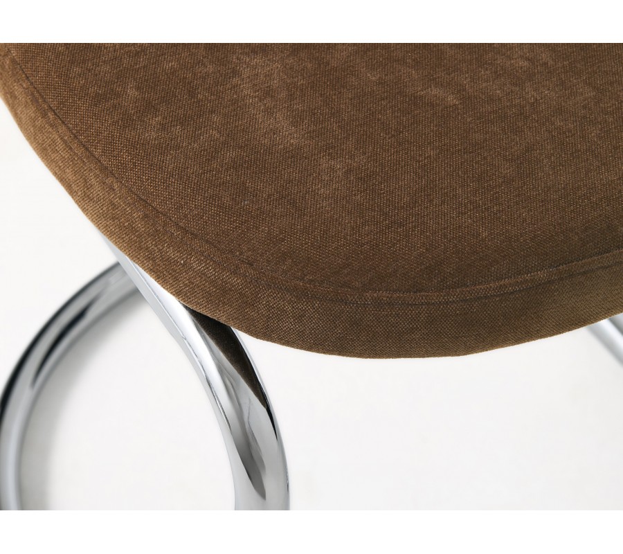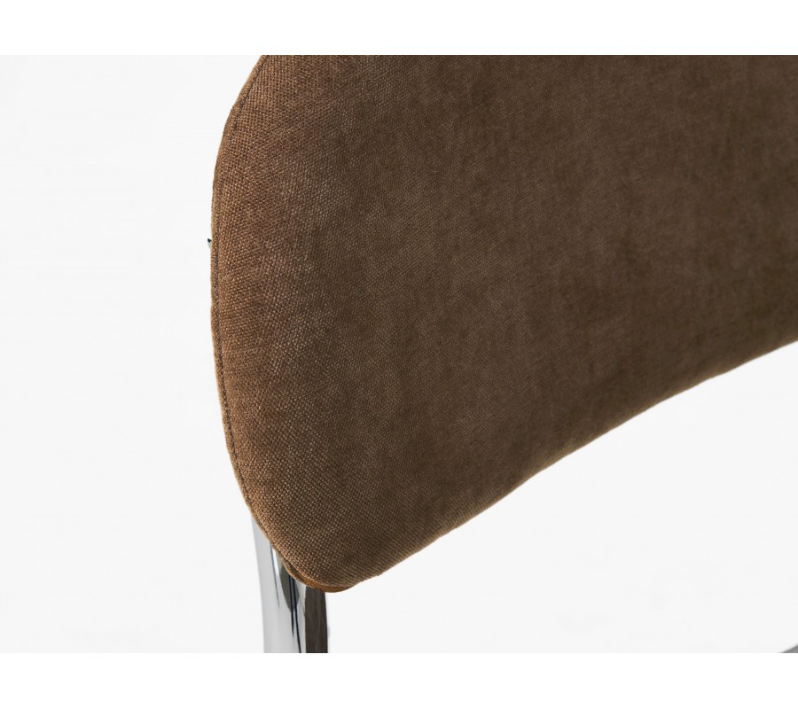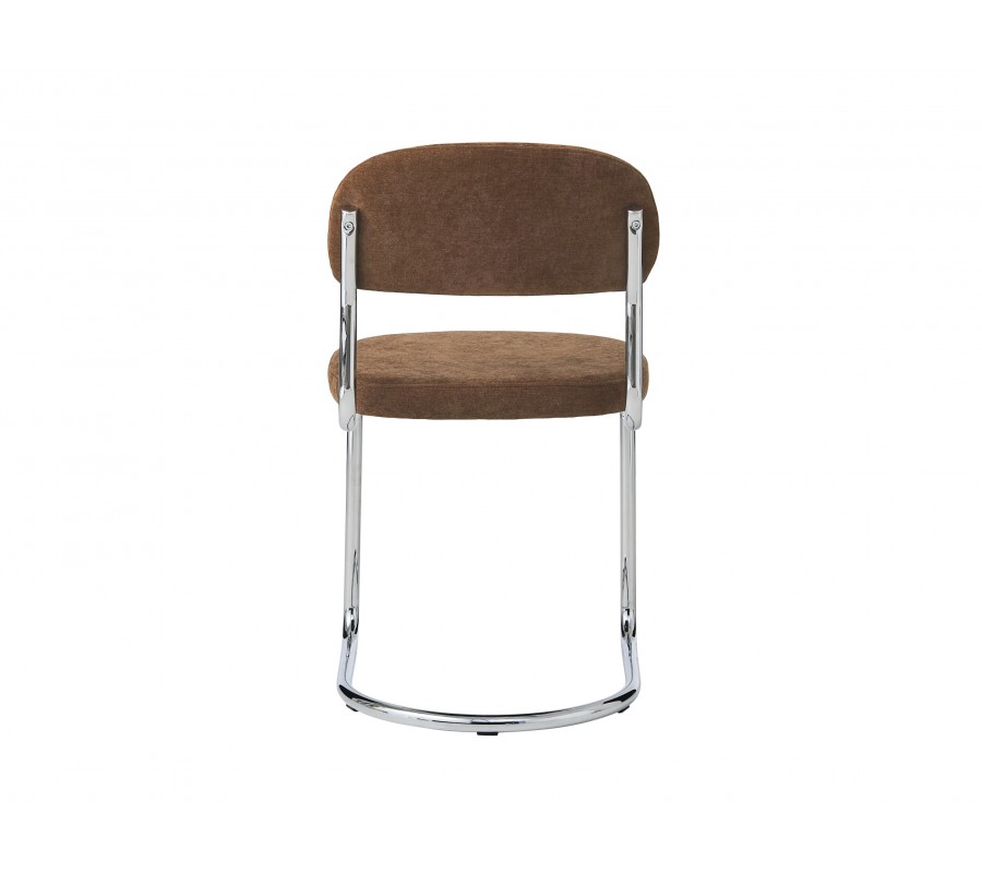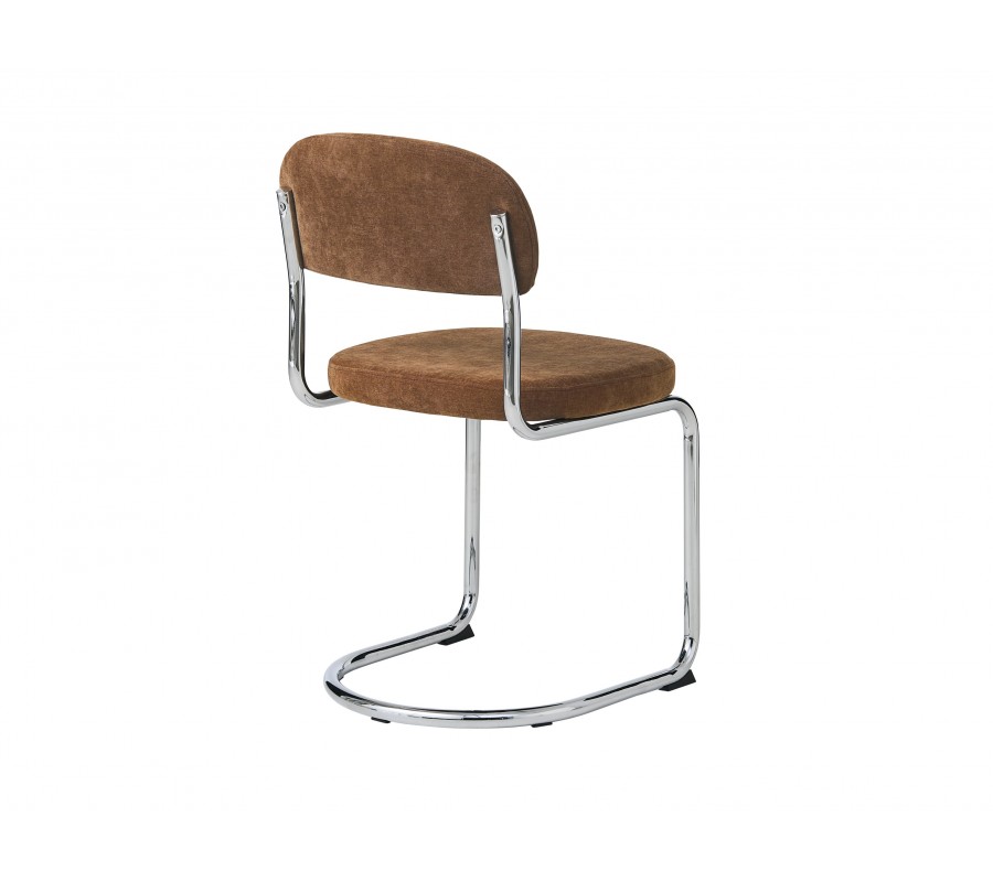 Kovová konstrukce v chromovém provedení působí elegantně a v kombinaci s konzolovým řešením připomíná ikonický retro styl s moderním nádechem. Potah z odolného mikrovlákna má jemnou ženilkovou texturu s decentním sametovým efektem, přičemž terakotová hnědá barva dodává židli kontrastní akcent.