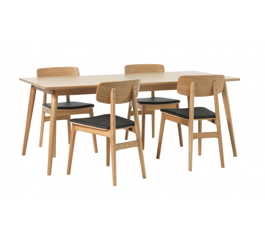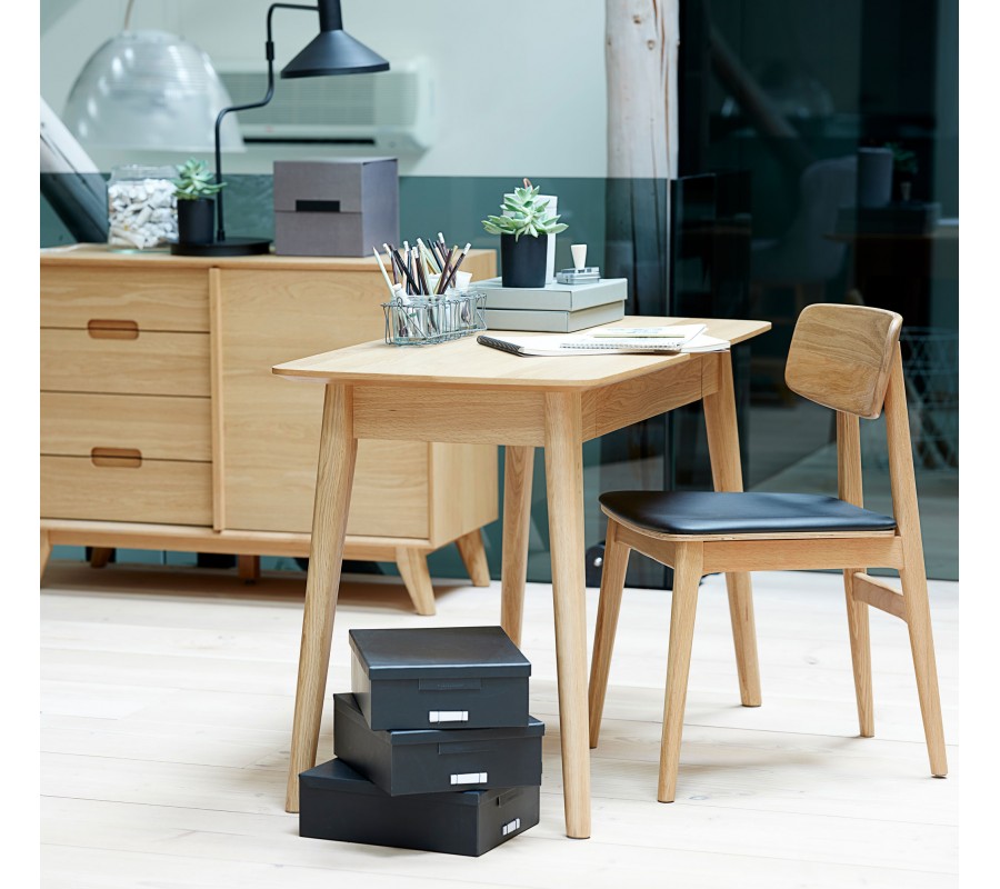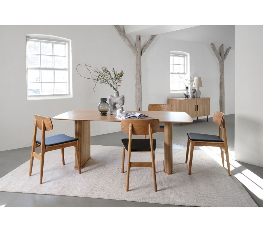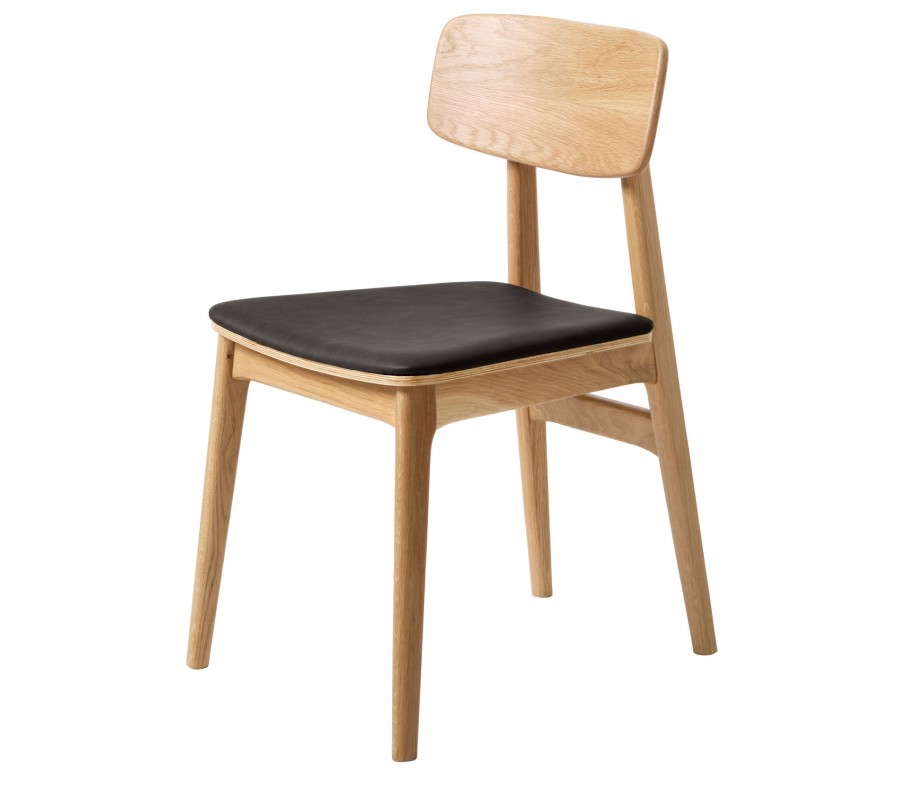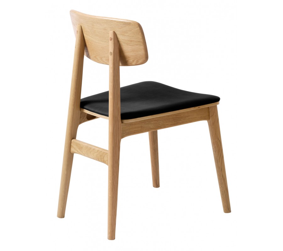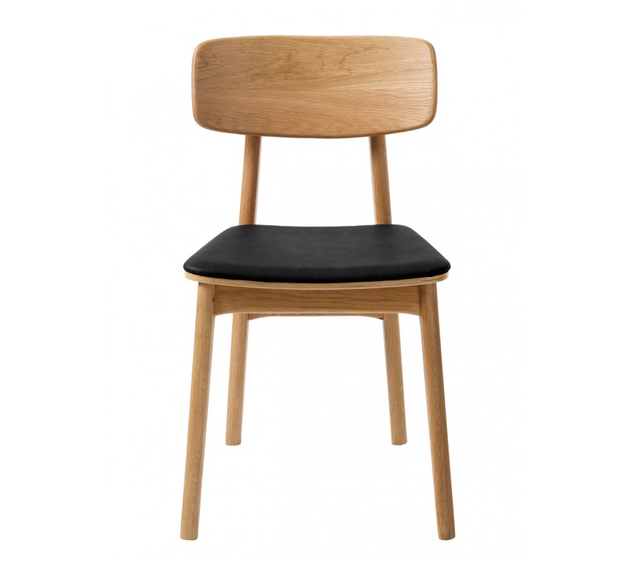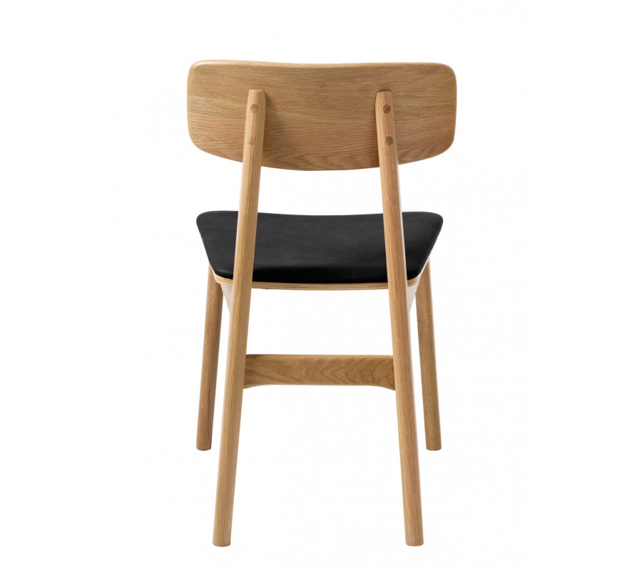 stolička má pevnou konstrukci, vyrobenou z dubového dřeva ve světlém hnědém provedení. Pravidelná kresba letokruhů podtrhuje naturální charakter materiálu a zároveň dodává nábytku typický skandinávský vzhled. Sedadlo je potaženo ekokůží v hladkém černém provedení, která vytváří sofistikovaný akcent ke dřevu. Je příjemná na dotek a zároveň nenáročná na údržbu.