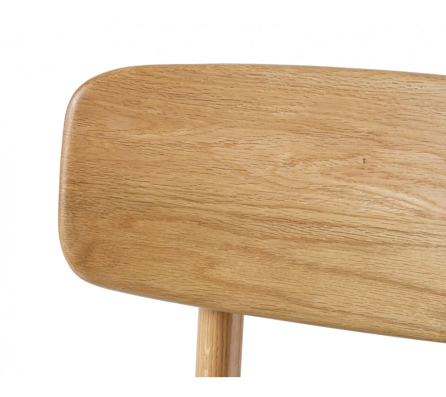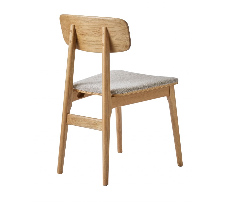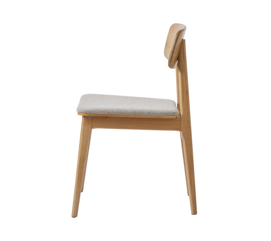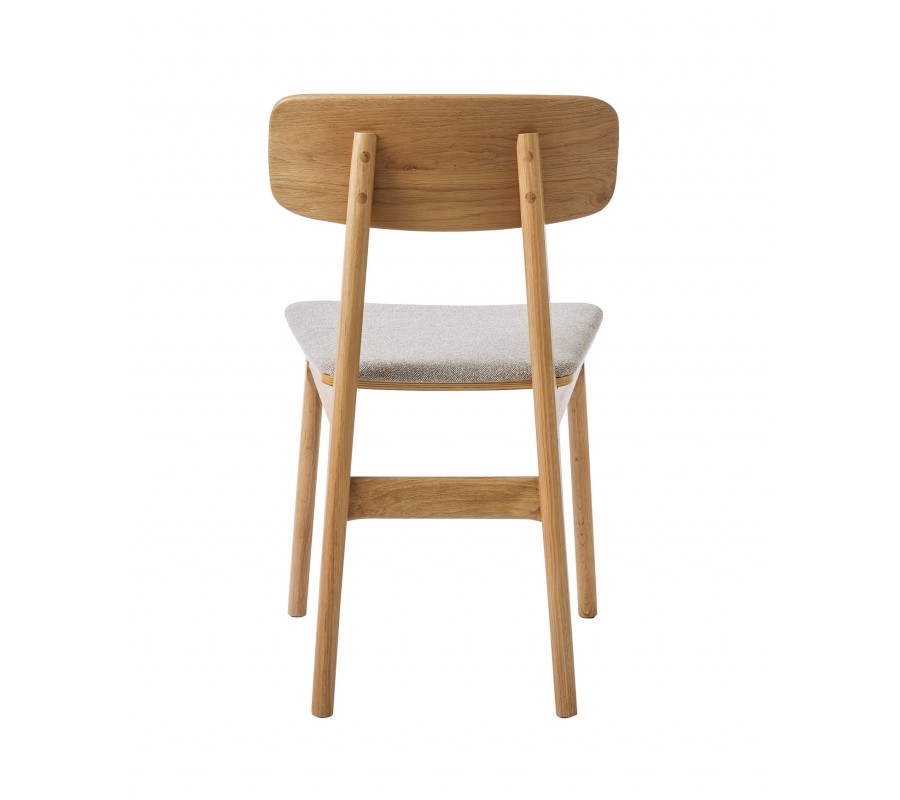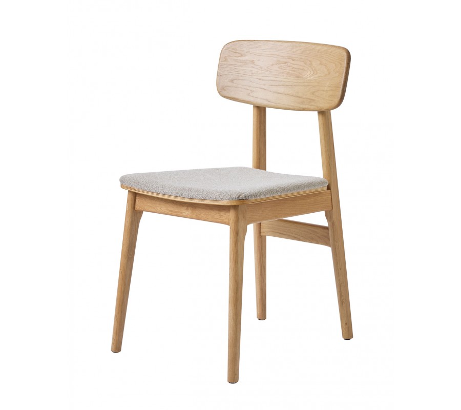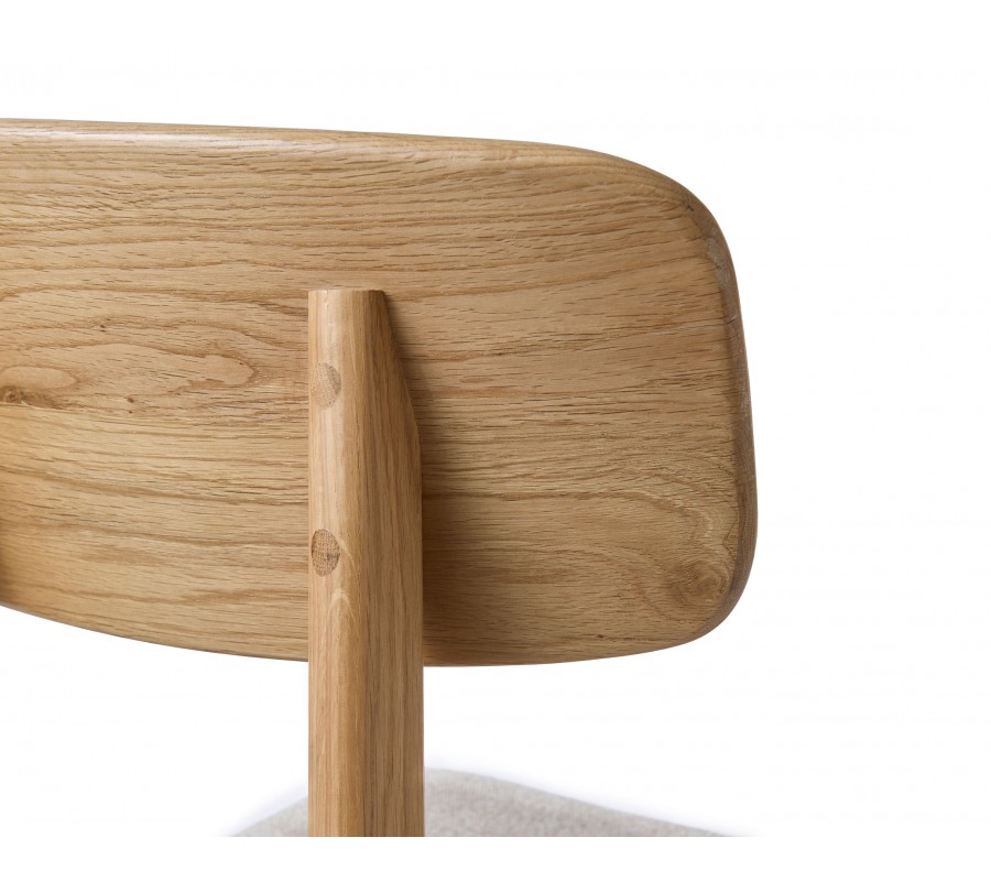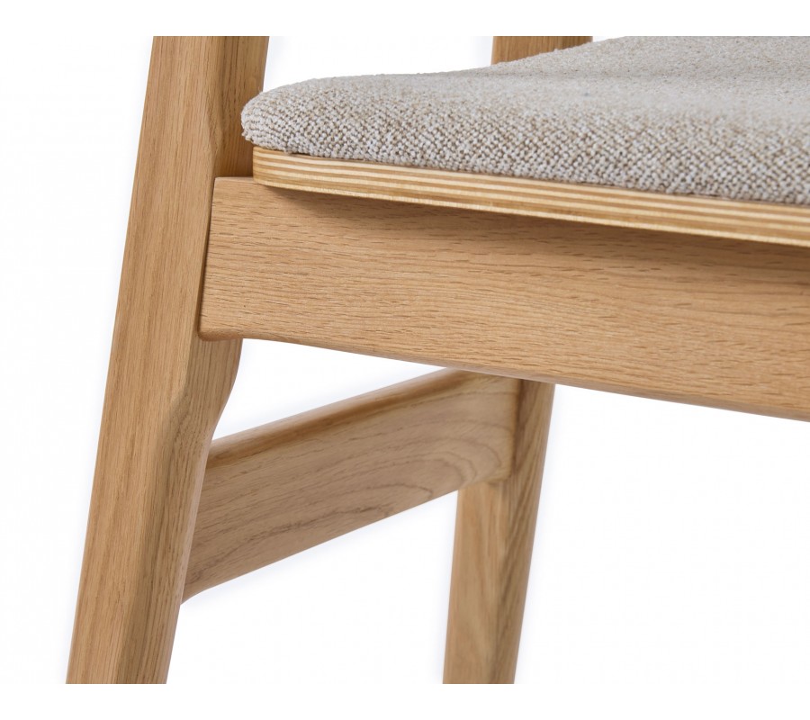 Konstrukce je vyrobena z dubového dřeva ve světlém hnědém odstínu, přičemž přirozená kresba letokruhů zvýrazňuje přírodní charakter materiálu. Sedadlo je čalouněno látkou se smyčkovitou strukturou, připomínající jemné buklé. Provedení v melírované bílo béžové barvě působí hřejivě. Potah je příjemný na dotek a díky mikrovláknu i pevný a odolný.