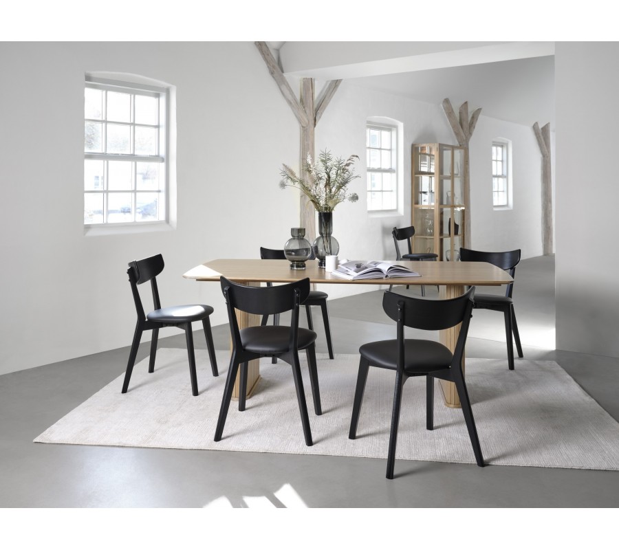 Černé lakování nechává viditelnou pravidelnou strukturu dubového dřeva, která vytváří přírodní akcent, výborně korespondující s černou ekokůží na sedadle. Toto provedení působí elegantně a snadno se kombinuje s dalším nábytkem.