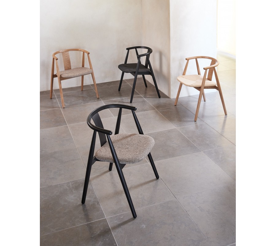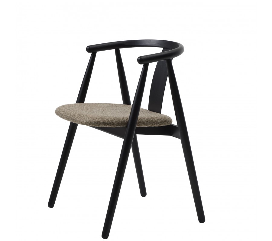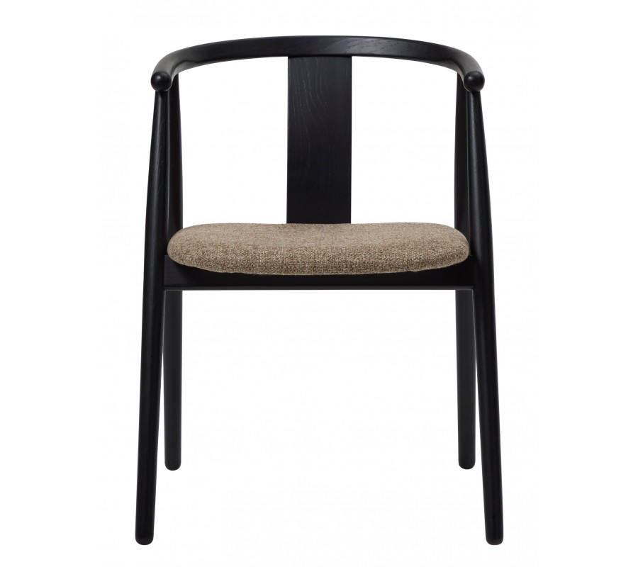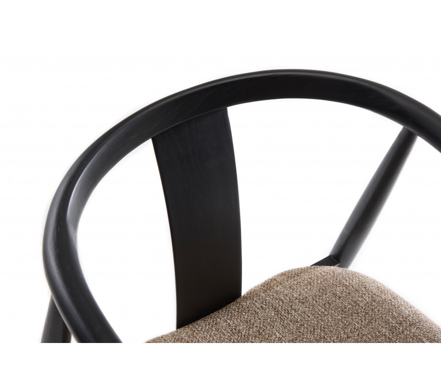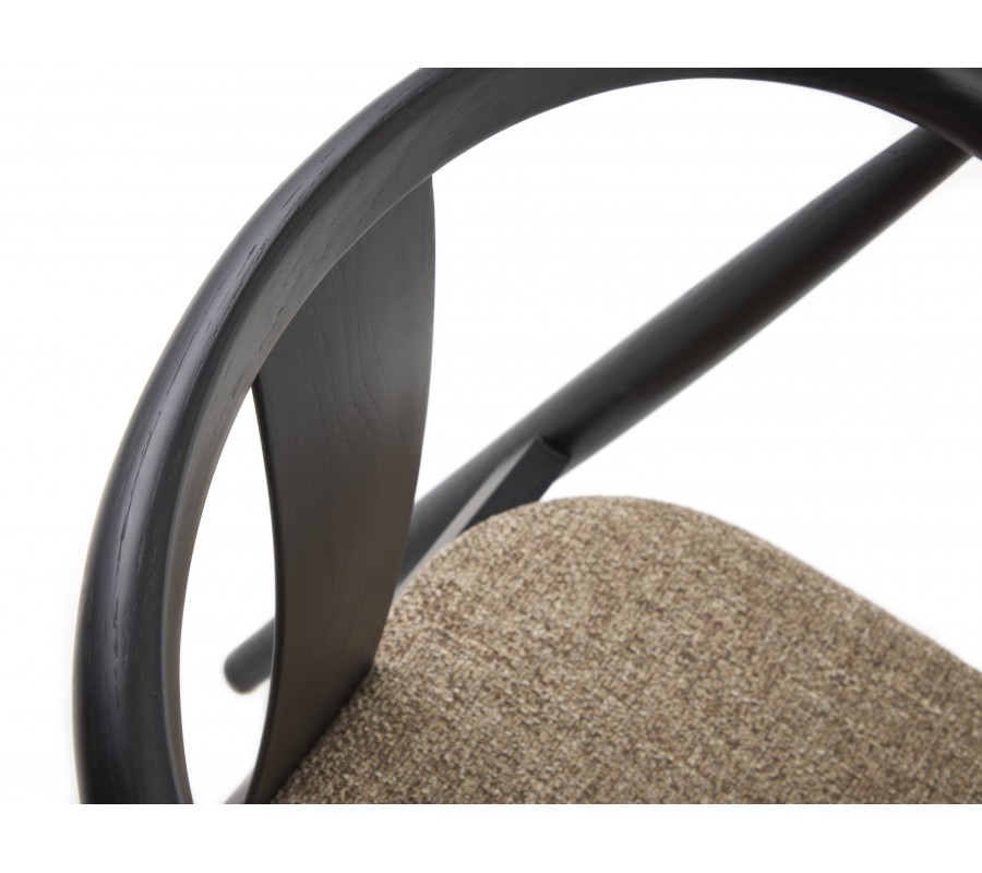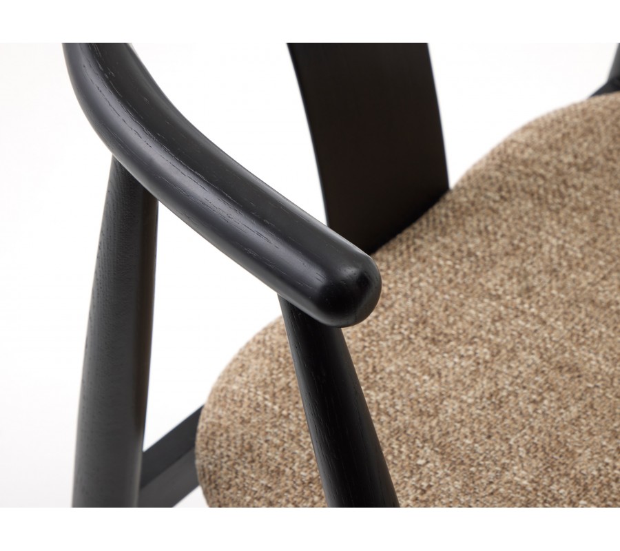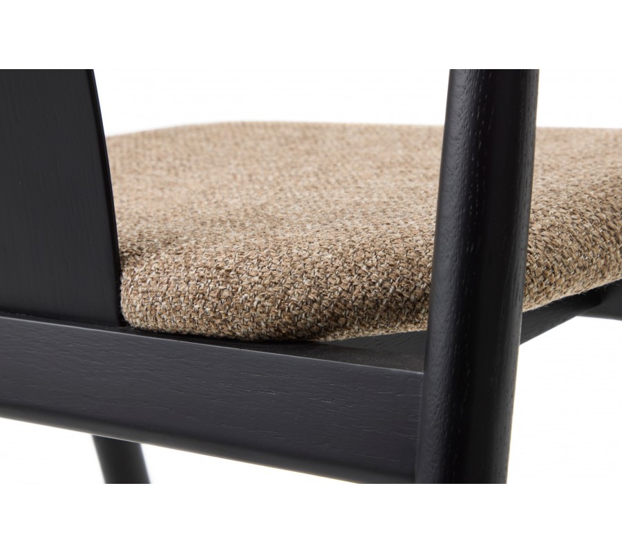 Rám je vyroben z masivního dubového dřeva v černém provedení, které zachovává kresbu dřeva a dodává židli elegantní vzhled. Sedák je čalouněný, což zjemňuje jeho linie. Potah má výraznou strukturu s melírovaným efektem v odstínech hnědé, šedé a béžové, které vytvářejí příjemný kontrast s tmavým rámem a zároveň korespondují s vizuálem dřeva. Textilie z mikrovlákna je příjemná na dotek a zároveň dostatečně odolná i na intenzivní každodenní používání.