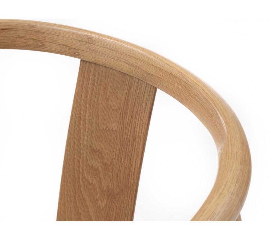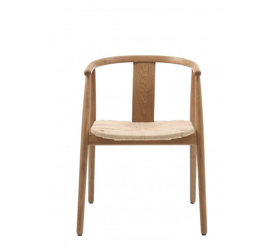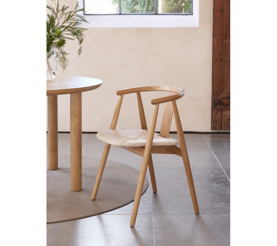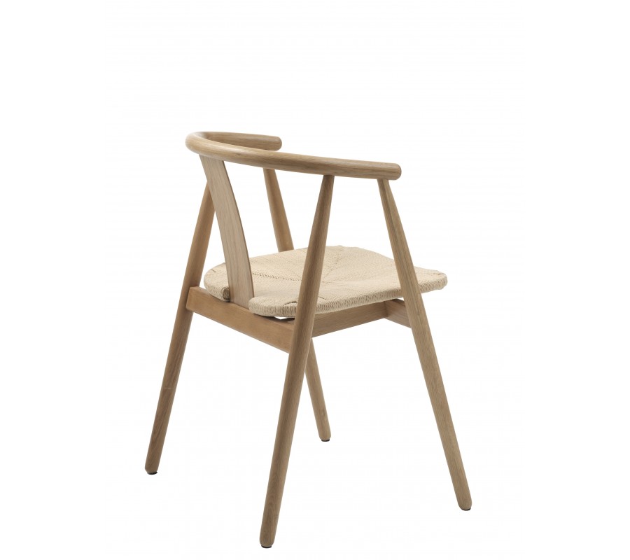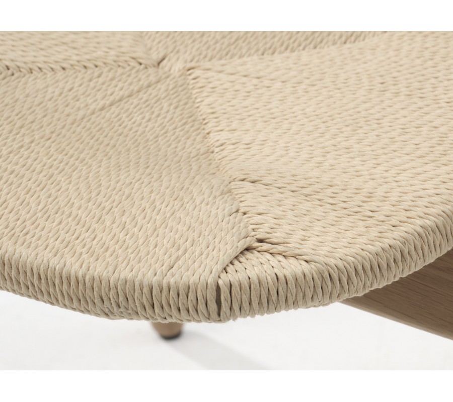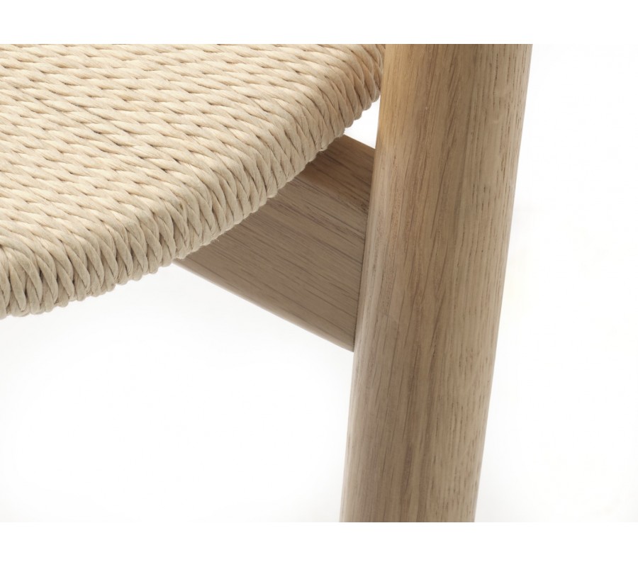 Rám židle je vyroben z masivního dubového dřeva v naturálním světlém hnědém odstínu, což zaručuje pevnost a spolehlivost i při každodenním používání. Sedadlo tvoří výplet z papírového kordu ve světle béžové barvě – jde o odolný přírodní materiál s dlouhou životností, který je oblíbený zejména ve skandinávském designu. Povrchová úprava nechává vyniknout kresbu dřeva i přirozenou strukturu výpletu, čímž židle působí teplo a přírodně.