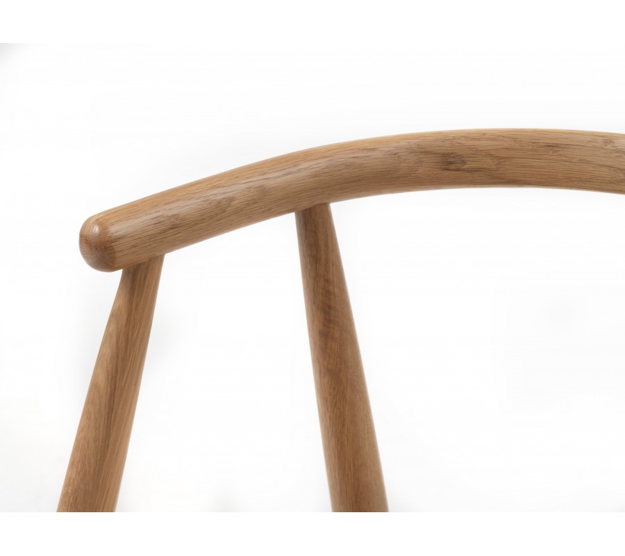 Celková silueta je vzdušná a odlehčená. Nohy mají ve vrchní části jemně zúžený válcovitý profil a na bocích jsou dynamicky zešikmeny směrem k sobě, čímž vytvářejí na každé straně zajímavý geometrický detail ve tvaru trojúhelníku. V horní části se napojují na obloukové opěradlo ve tvaru U, které poskytuje pohodlnou oporu zad. Stabilitu zajišťují příčné výztuhy mezi nohama. Na nich je upevněno sedák se zaoblenými rohy. V jeho zadní části je výřez, ve kterém je zasazena plochá vertikální spojnice s opěradlem, což zvyšuje komfort a zároveň vytváří stylový designový prvek.