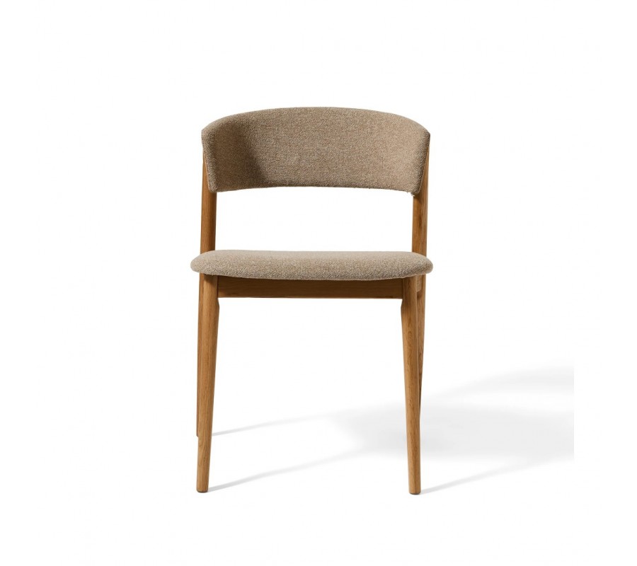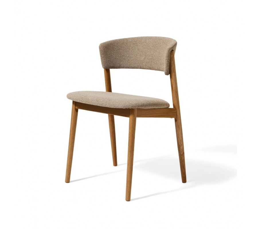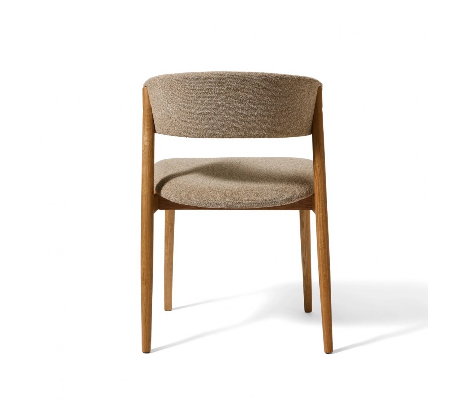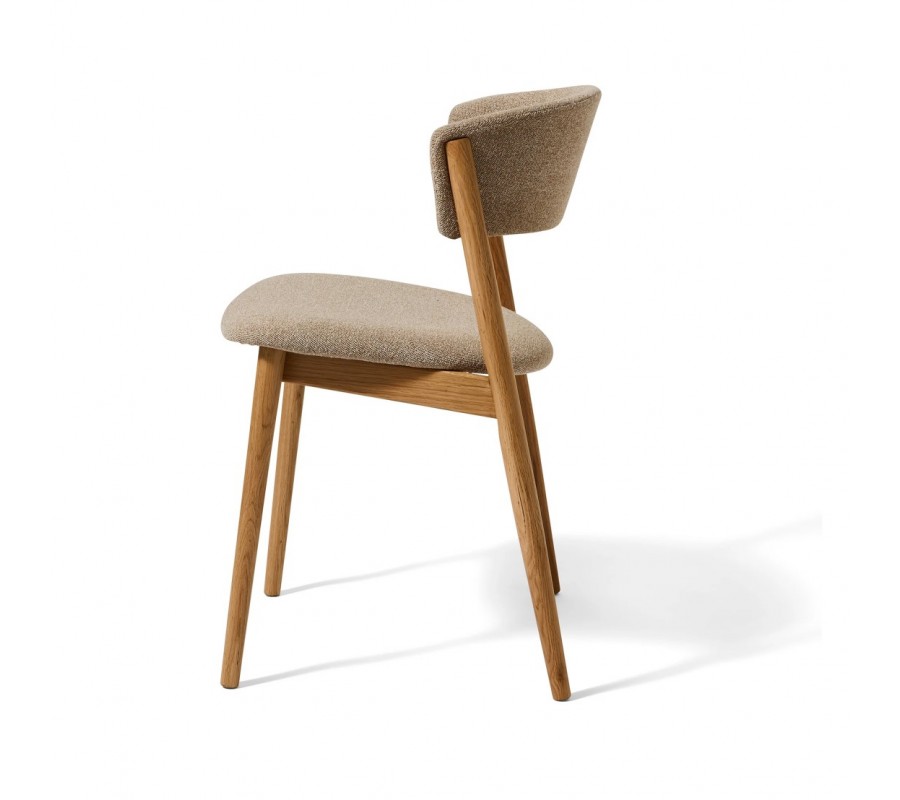 Ergonomicky tvarované sedátko zajišťuje pohodlné sezení i během delších chvil u stolu. Je osazeno na obdélníkovém rámu, který je spojen s válcovitými nožičkami. Jejich zešikmené linie působí dynamicky, zatímco zúžené zakončení zvýrazňuje elegantní vzhled. Zadní nohy plynule přecházejí nad sedák, až k opěradlu, které je tvarováno do U, aby se přirozeně přizpůsobilo tělu. Vrchní hrana opěrky má polobloukovou siluetu.