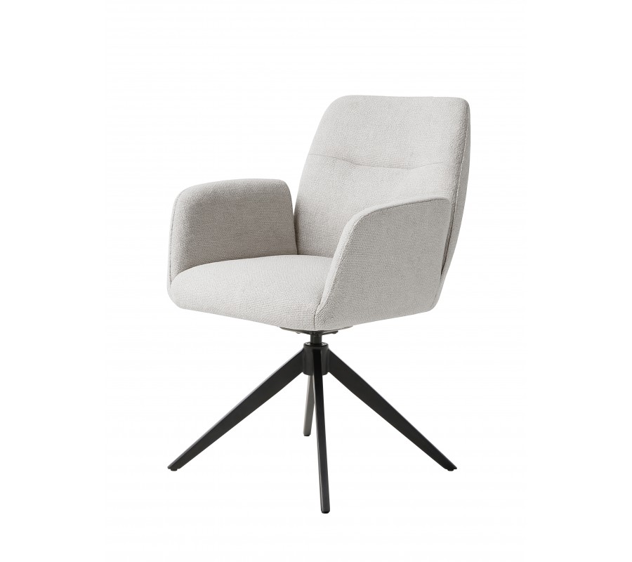 Sedací část má hranatou opěrku zad a obdélníkové boční opěrky, stojící samostatně, což dodává židli odlehčenou vzdušnou siluetu. Pěnová výplň elegantně zaobluje moderní lineární tvary a zároveň zaručuje v kombinaci s mírným záklonem opěrky pohodlí i při delším sezení. Potah je vyroben z mikrovlákna, které je mimořádně odolné a výborně odolá vlivům každodenního používání. Ženilkový finiš má jemně sametový lesk a je příjemný na dotek. Světlé šedé provedení působí sofistikovaným neutrálním dojmem a zdůrazňuje moderní minimalismus designu.
