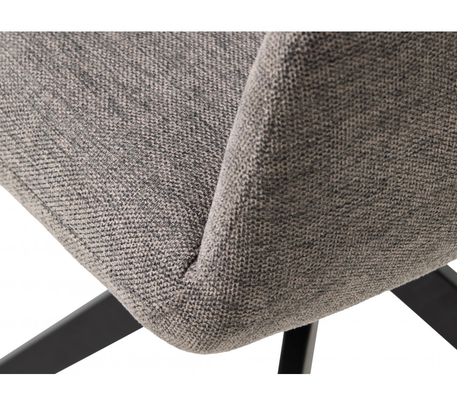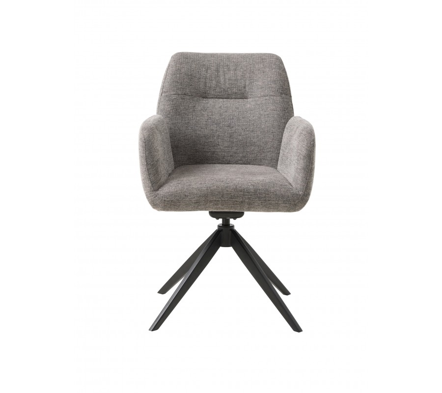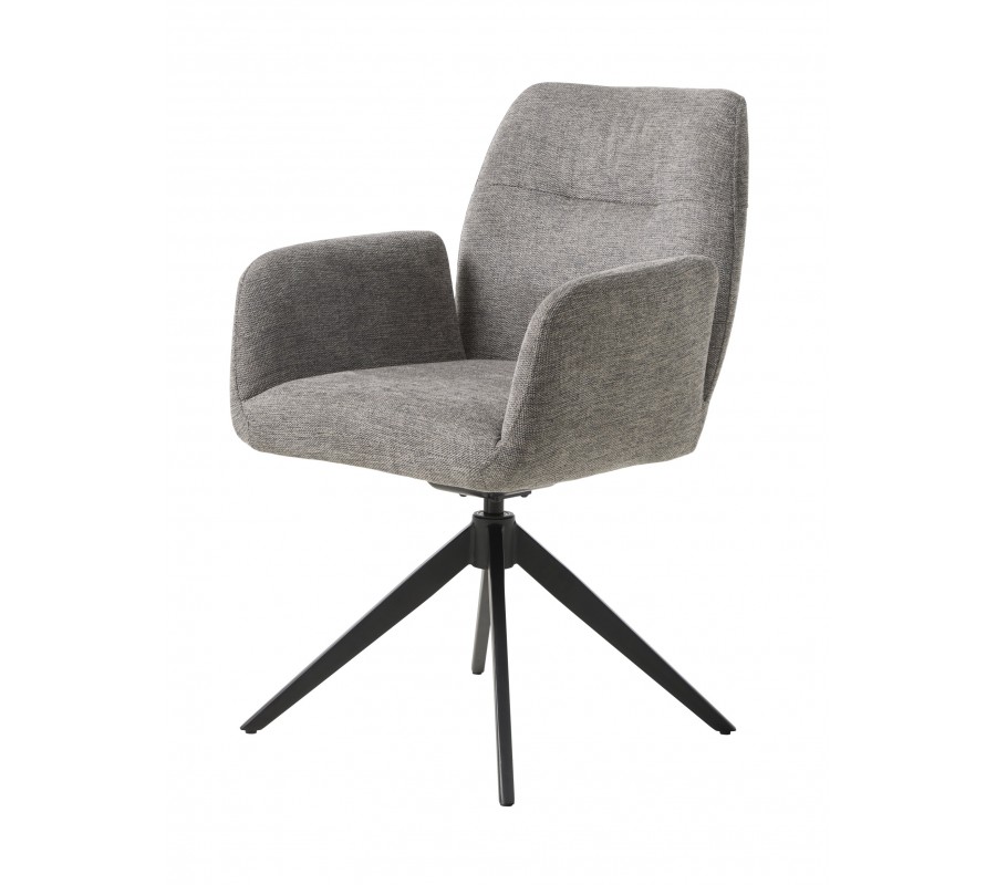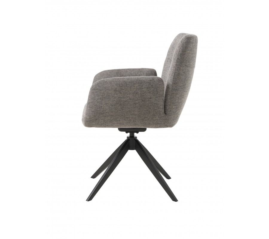 Sedadlo doplňuje hranatá opěrka zad a samostatně stojící boční područky obdélníkového tvaru, díky čemuž působí židle opticky snadno a vzdušně. Výplň z kvalitní pěny zaobluje rovné linie a spolu s mírně nakloněnou opěrkou zajišťuje pohodlí i při delším stolování. Potah z odolného mikrovlákna je přizpůsoben každodennímu intenzivnímu používání a vyniká dlouhou životností. Hladké tkaní s melírovaným efektem dodává tmavšímu šedému provedení elegantní a sofistikovaný vzhled.
