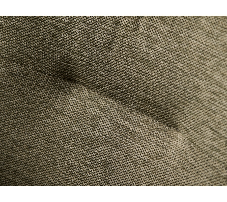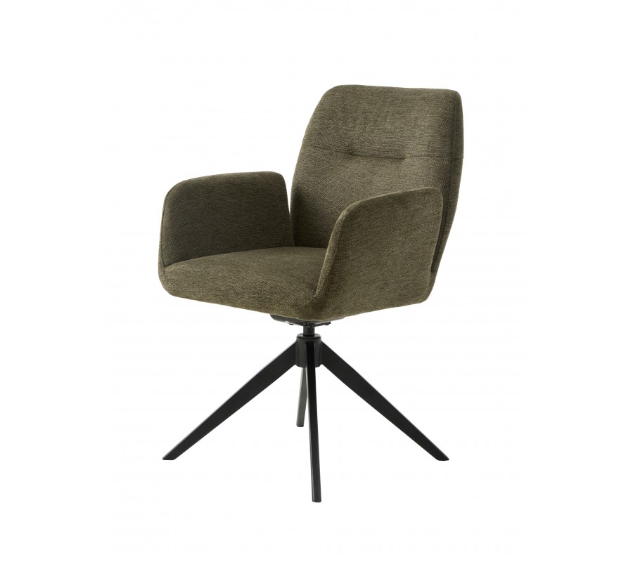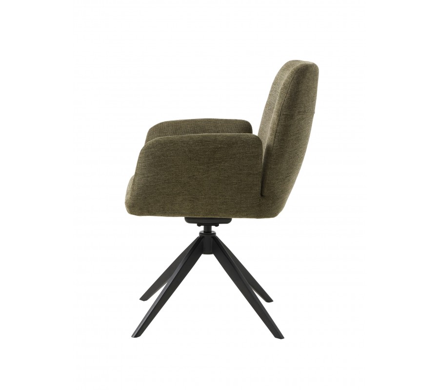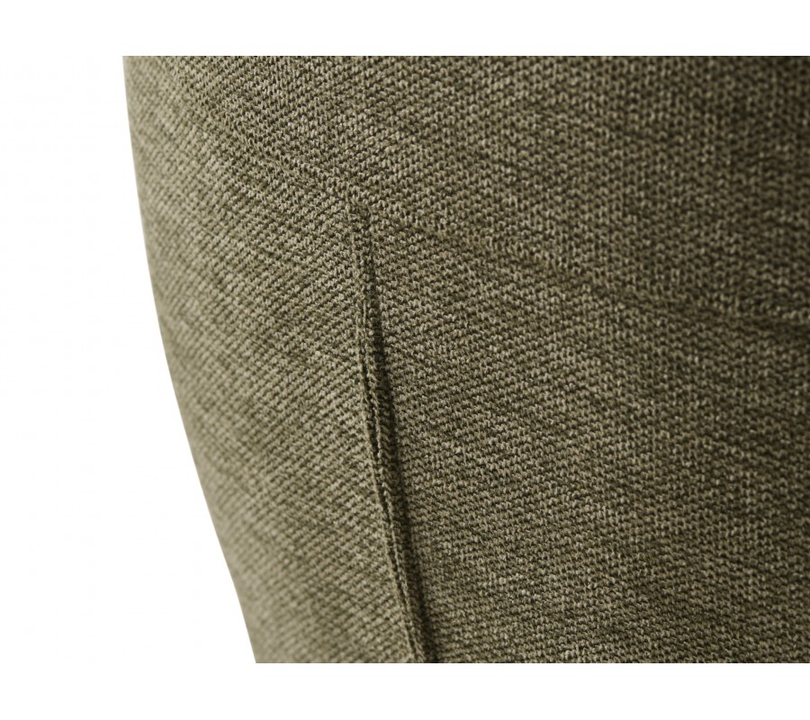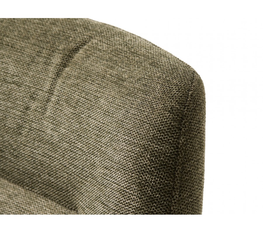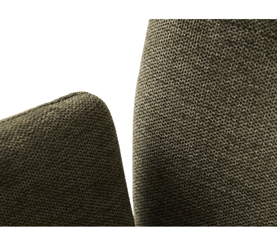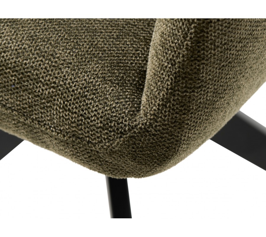 Design židle je postaven na minimalistické siluetě se zaoblenými detaily. Po stranách sedadla jsou umístěny nižší, samostatně stojící opěrky na ruce obdélníkového tvaru, které dodávají celku lehkost a vzdušnost. Vyšší zádová opěrka má hranatý tvar se zjemněnými rohy a je mírně nakloněna, což spolu s měkkou pěnovou výplní zaručuje pohodlné sezení i během delších chvil u stolu. Potah z mikrovlákna je odolný vůči běžnému opotřebení a příjemný na dotek, přičemž jeho jemná struktura v olivovém odstínu s melírovaným efektem podtrhuje elegantní vzhled.