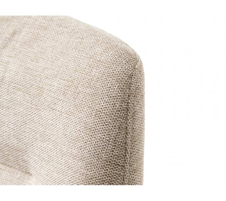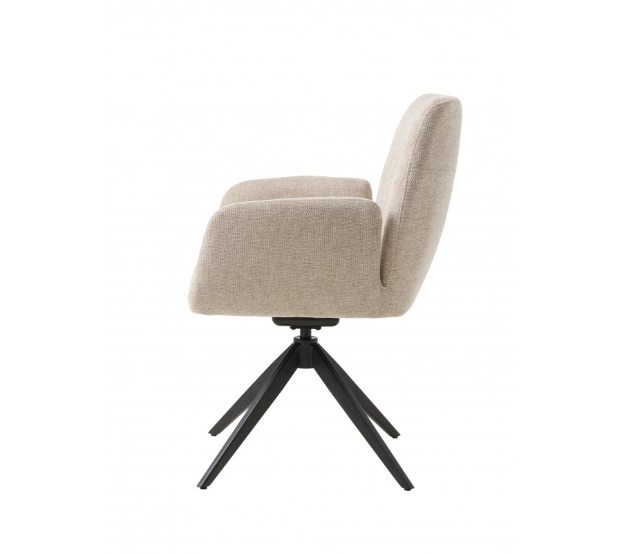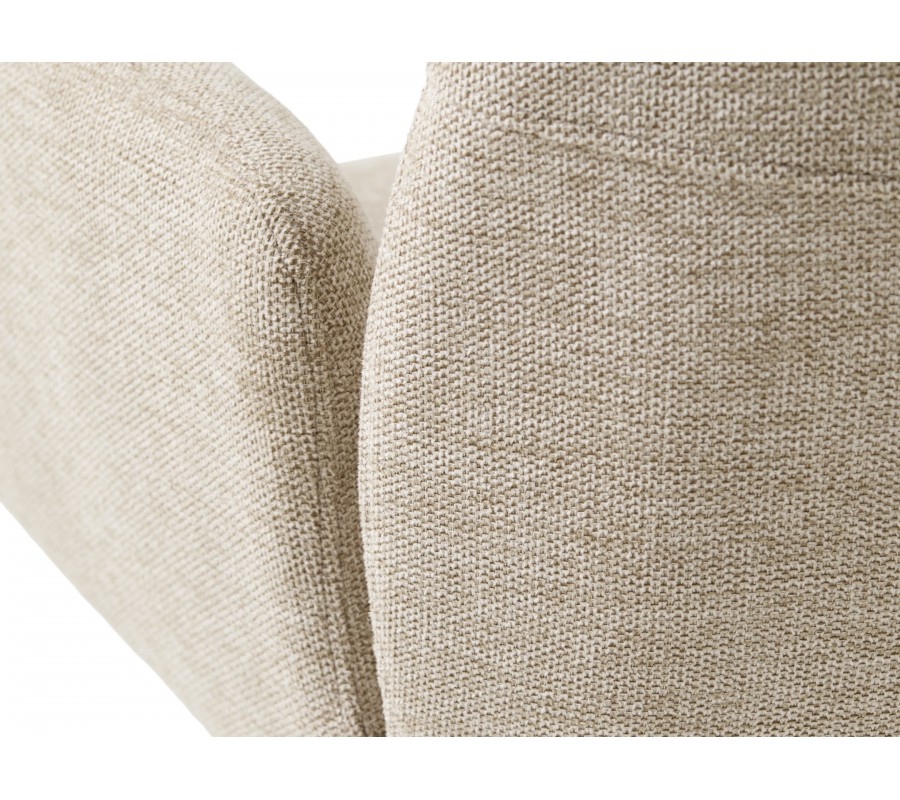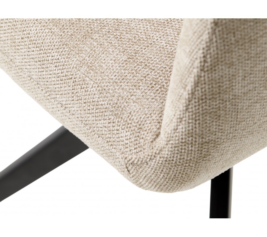 Sedadlo má obdélníkový tvar a plynule na něj navazuje hranatá opěrka zad, která je jemně nakloněna pro pohodlnější opření. Po bocích se nacházejí nižší opěrky na ruce rovnou vrchní stranou. Nejsou propojeny s opěrkou, čímž celek působí snadno a vzdušně. Sedací část pokrývá měkké pěnové čalounění, které zaobluje celkové kontury a rohy židle. Potah z odolného mikrovlákna je ideální i pro každodenní intenzivní používání. Jemně strukturovaný povrch s melírovaným efektem v kombinaci se světlým pískovým béžovým odstínem dodává židli elegantní charakter.